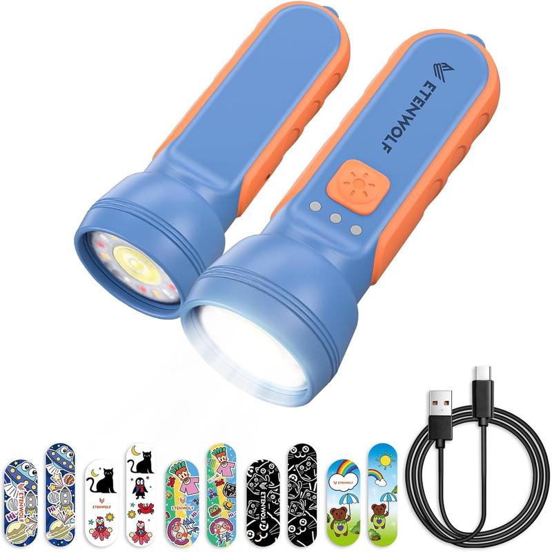 ETENWOLF Kids Flashlight Rechargeable Mini Flashlight with Fun Stickers 1500mAh Battery Adjustable Brightness with 6 Light Modes IPX5 Waterproof Flashlight for Home Camping and Emergencies