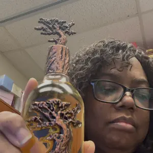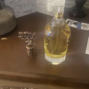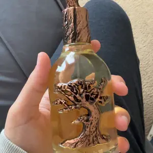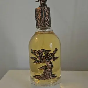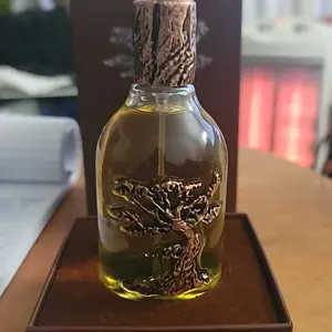 Product Specifications: Glass bottle, with tree design, bronze cap with tree, 3.4 oz