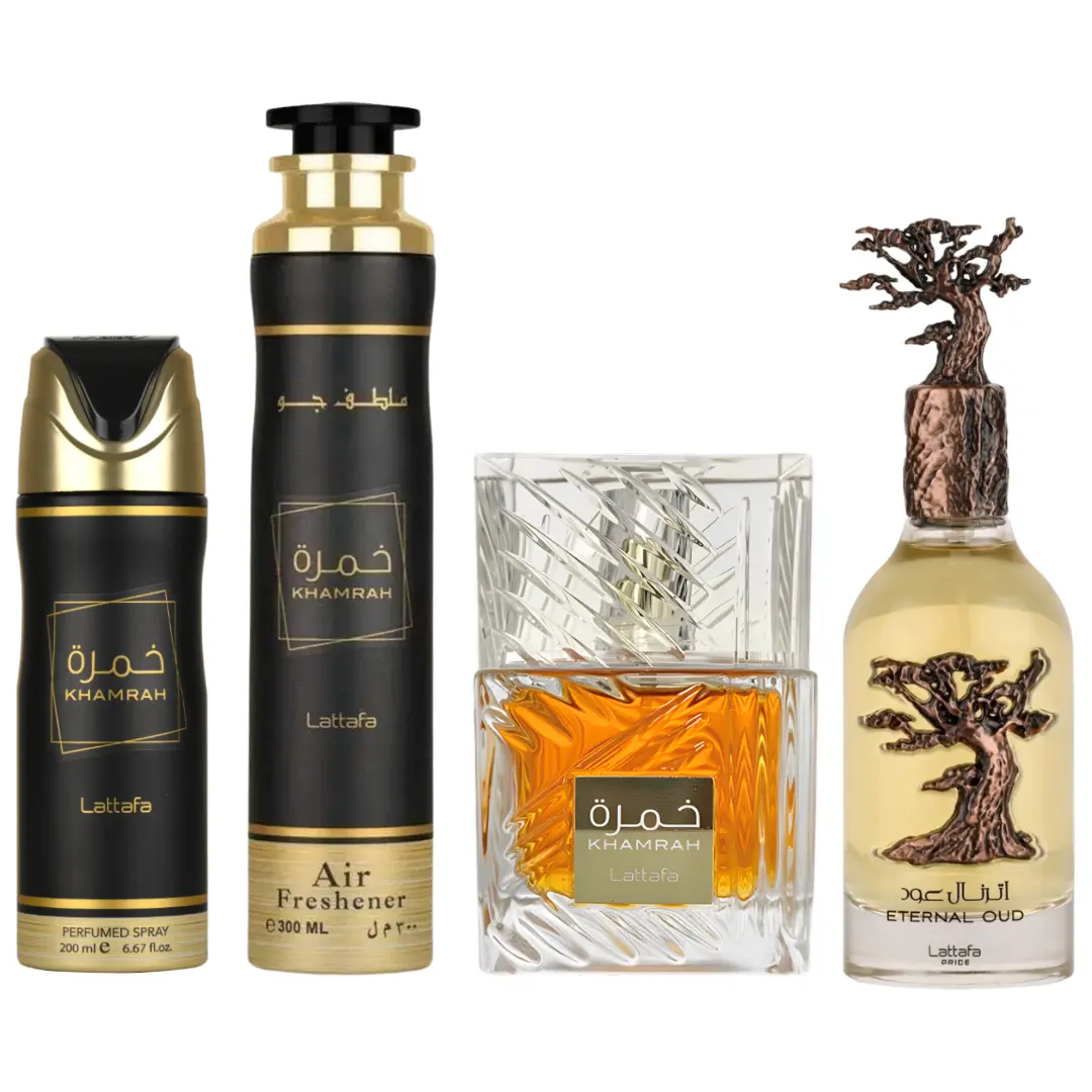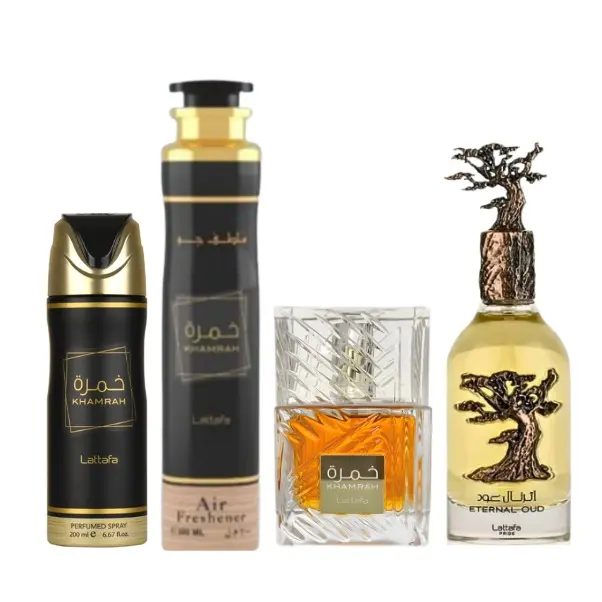 Experience the luxury and warmth of oriental fragrance artistry with this comprehensive set featuring Eternal Oud and the Khamrah line, including Khamrah Perfume, Khamrah Deodorant, and Khamrah Air Freshener. Each product is designed to envelop you in rich, exotic aromas that elevate your environment and enhance your personal scent profile.