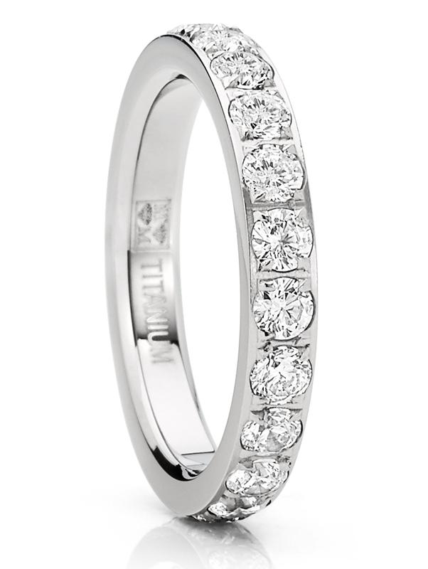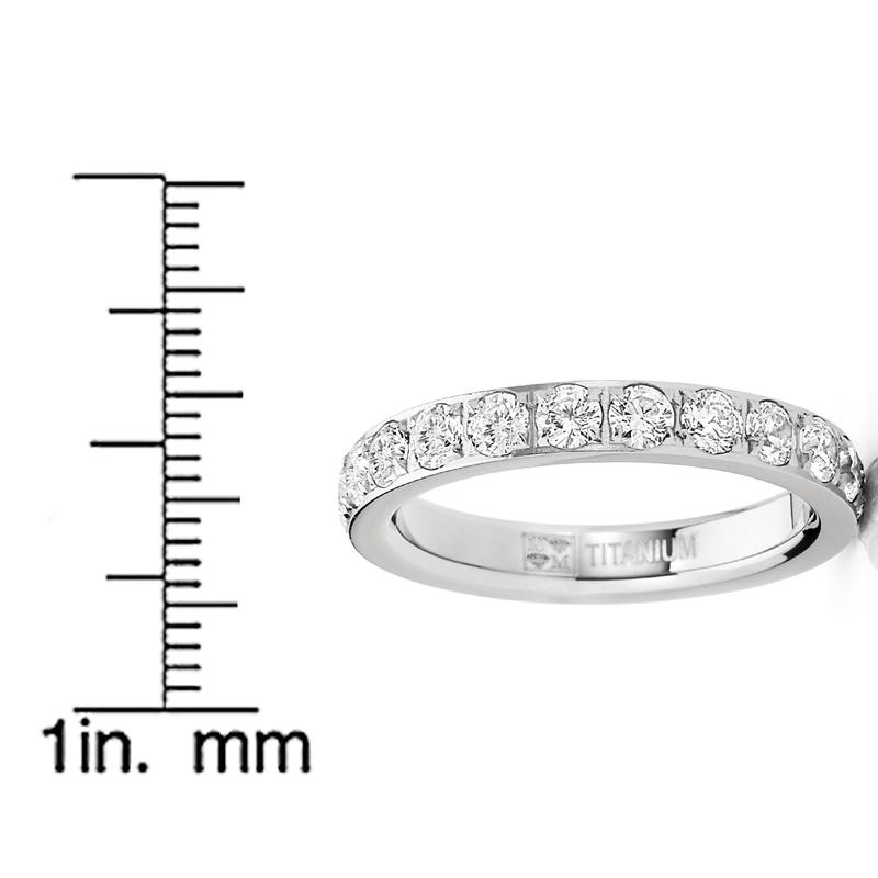 Add an extra touch of radiance for your look with this 3 millimeter wide, stunning eternity wedding band. Crafted from light-weight and scratch-resistant titanium, this striking ring features a pave set round-cut clear zirconia band in a glittering line.