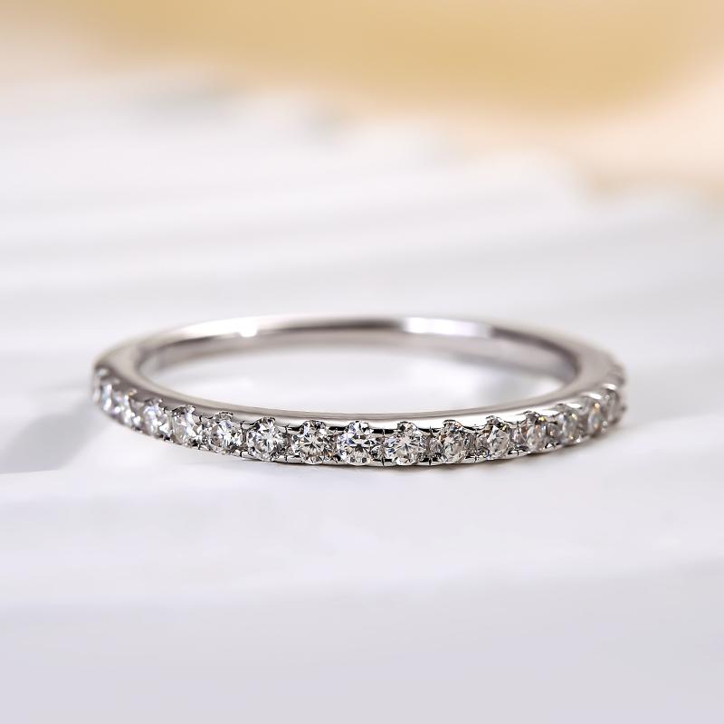 Introducing the Maxine Eternity Round Cut Synthetic Moissanite Wedding Band, a timeless symbol of enduring love. This exquisite band features a continuous circle of brilliantly cut synthetic moissanite stones, each reflecting a dazzling sparkle that captivates the eye. Crafted with precision and care, this elegant wedding band beautifully complements any engagement ring or shines magnificently on its own.