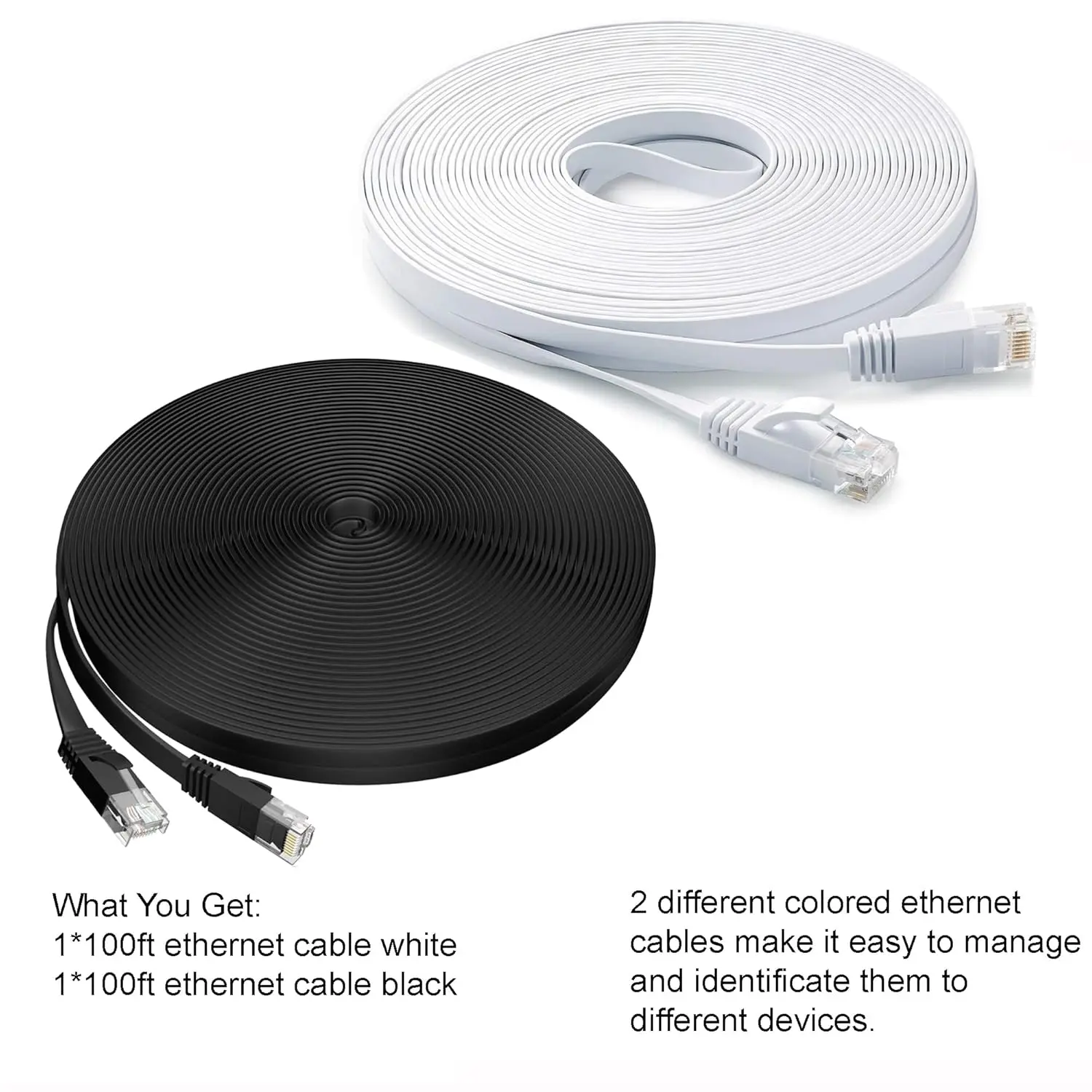What You Get: 2 * ethernet 100 ft, 20 * flat clips, 10 * ties.