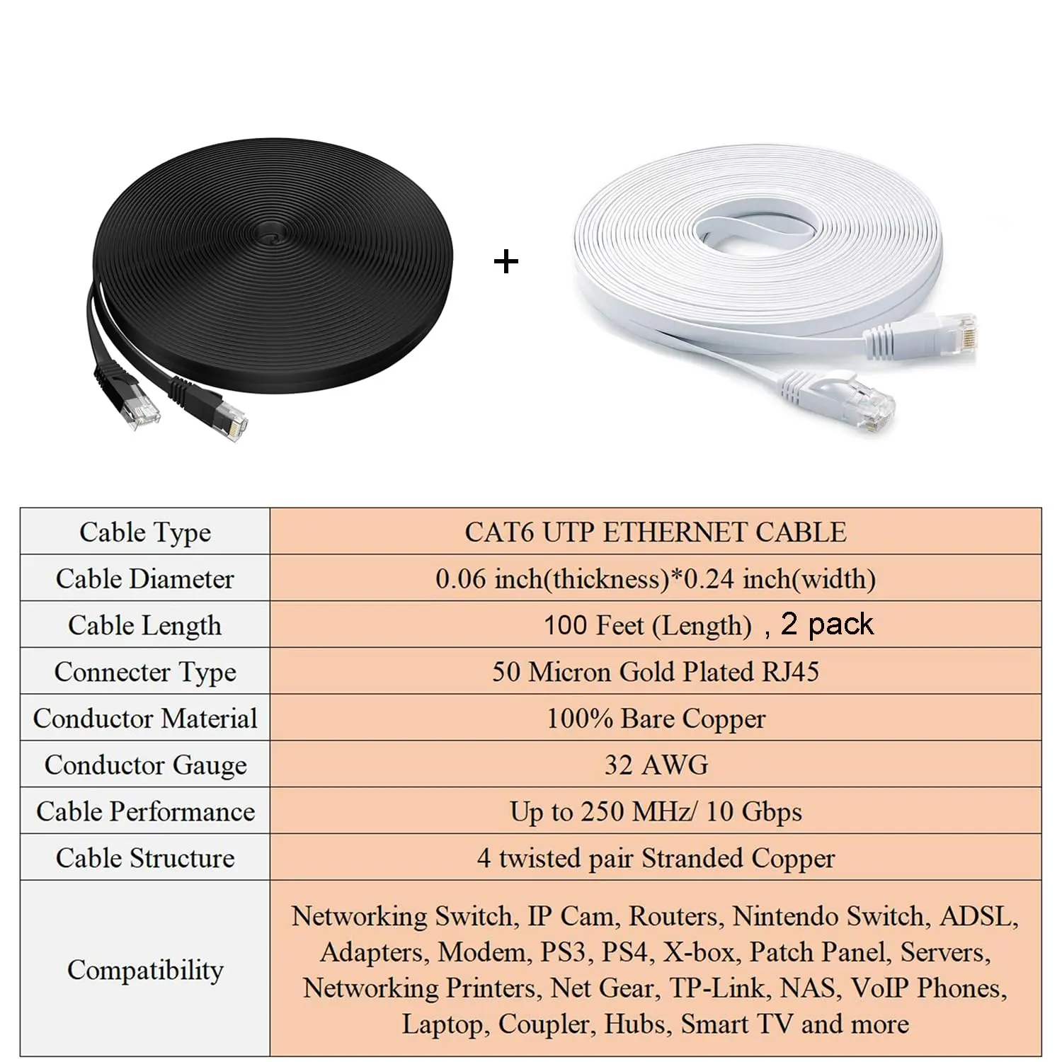 2 pack UTP(Unshielded Twisted Pair) long with RJ45 Connectors and are made of bare copper wire, ensure minimal noise and interference.