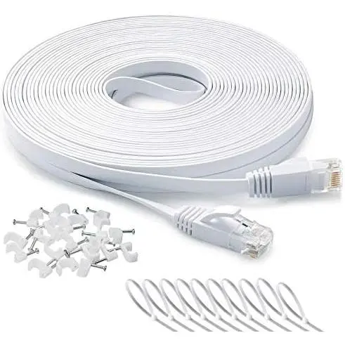 Ultra-thin 100 ft flat helps avoid tangled cords and saves space, can't even feel or see the run under a rug or carpet and easier to line up against the wall. 100 ft cat6 bundled with 20 clips & 10 ties, to nailed to the wall, or tie to the table , no mess cables in you house.