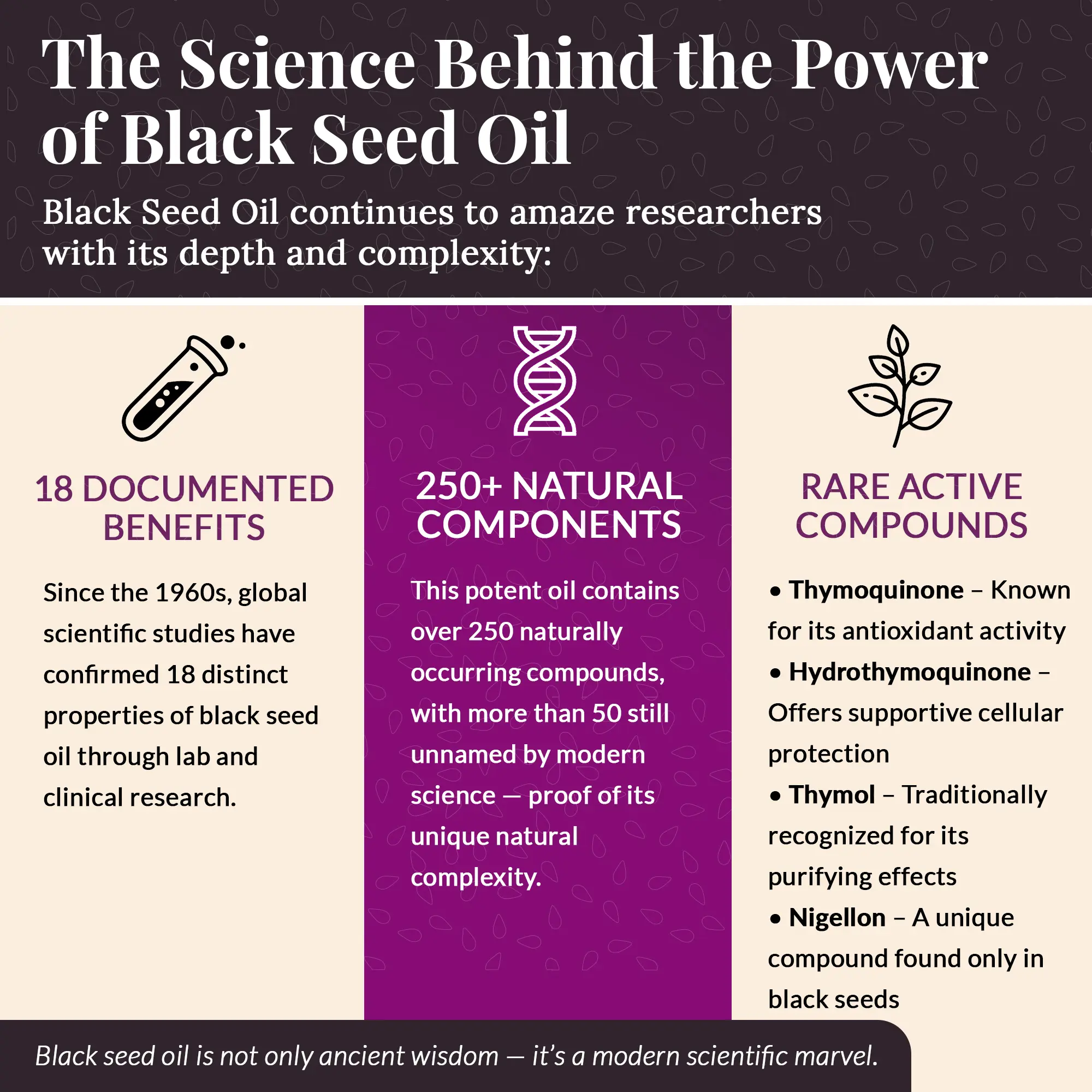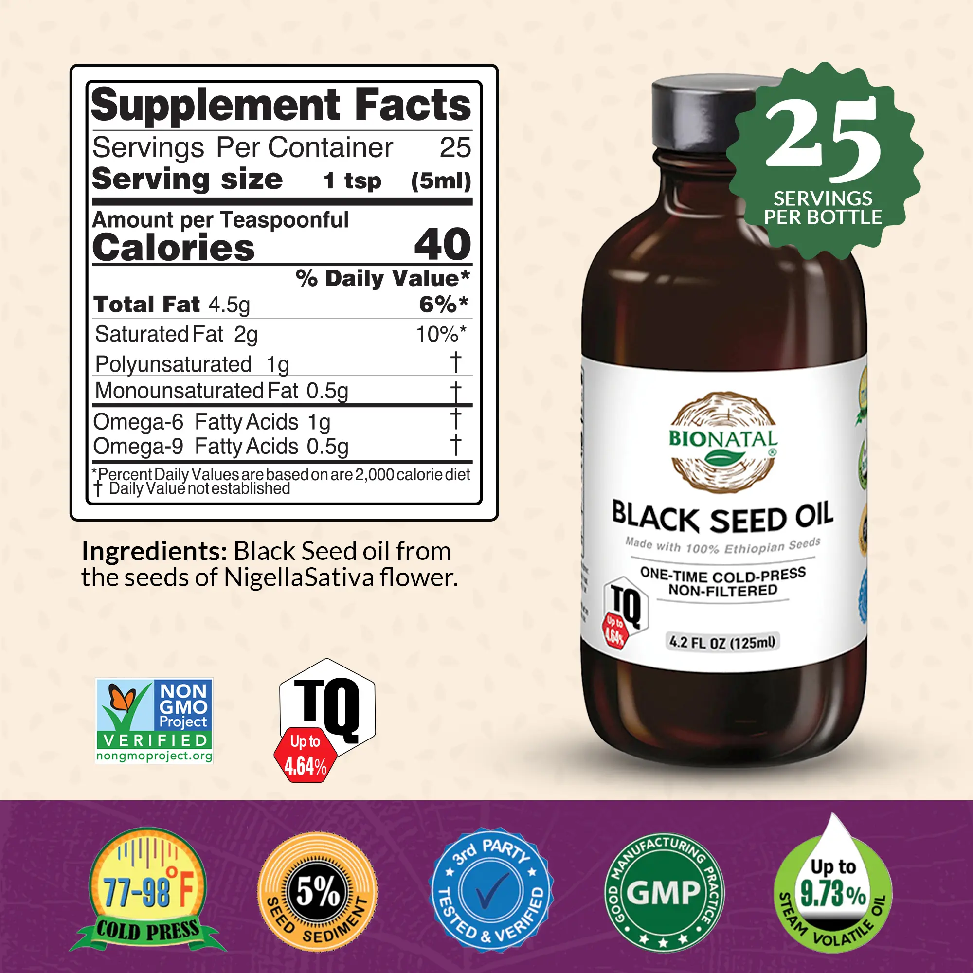 BioNatal uses only naturally grown, non-GMO Nigella sativa seeds harvested within the last 12 months. The oil is cold-pressed at low temperatures (77–98°F) without chemicals, solvents, filtering, or blending. Each batch is third-party tested for Thymoquinone (TQ), with levels verified up to 4.64%, reflecting exceptional natural potency.