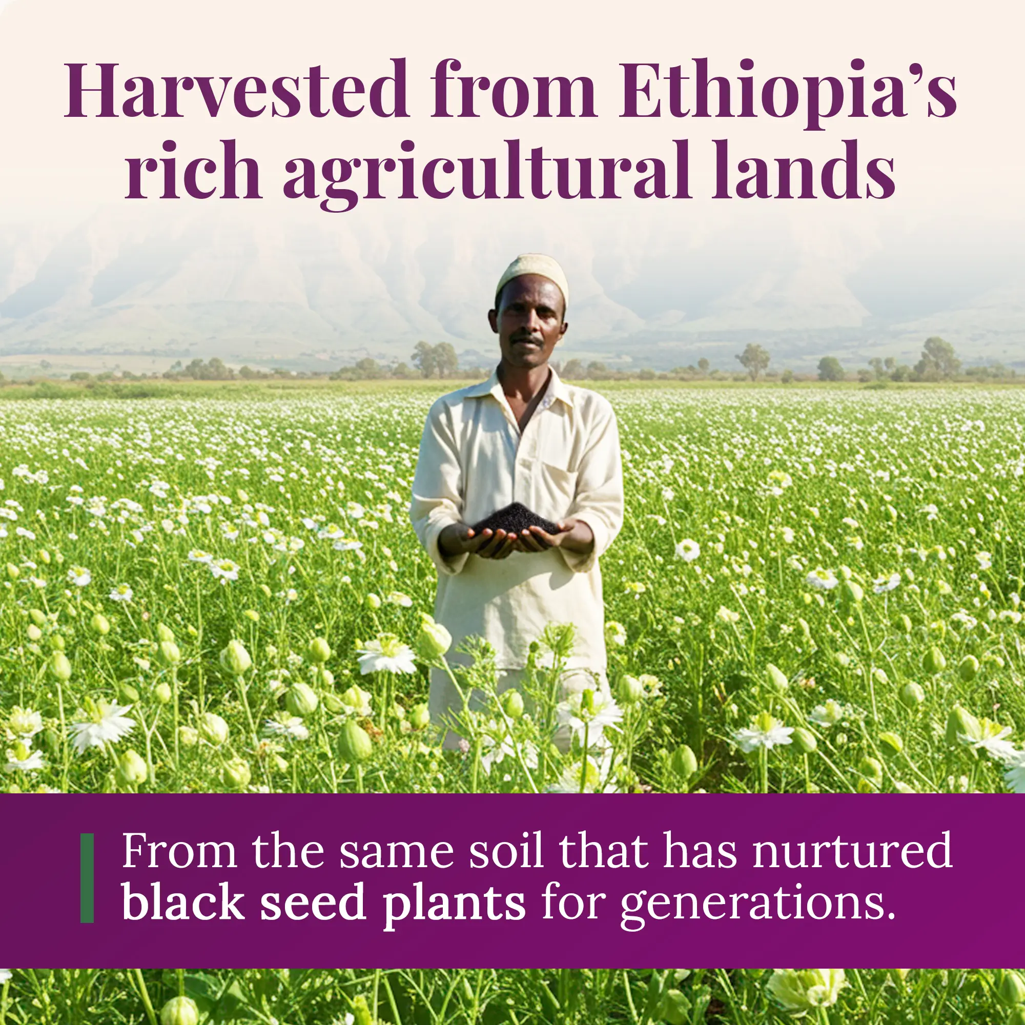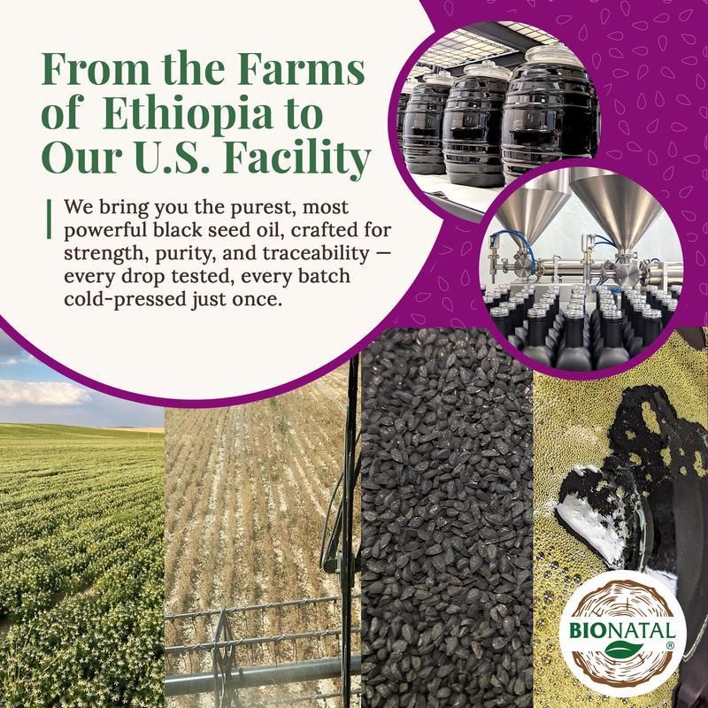 Experience the purity of authentic Ethiopian black seed oil. BioNatal Ethiopian Black Seed Oil is 100% pure, cold-pressed, unrefined, and unfiltered Nigella sativa seed oil, sourced from certified farms in Ethiopia and produced in small batches for freshness, consistency, and quality.