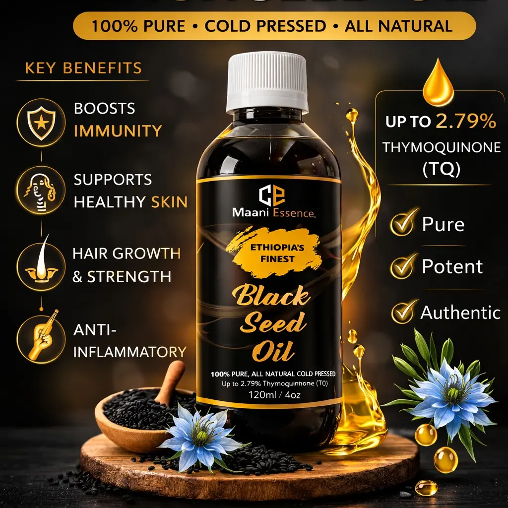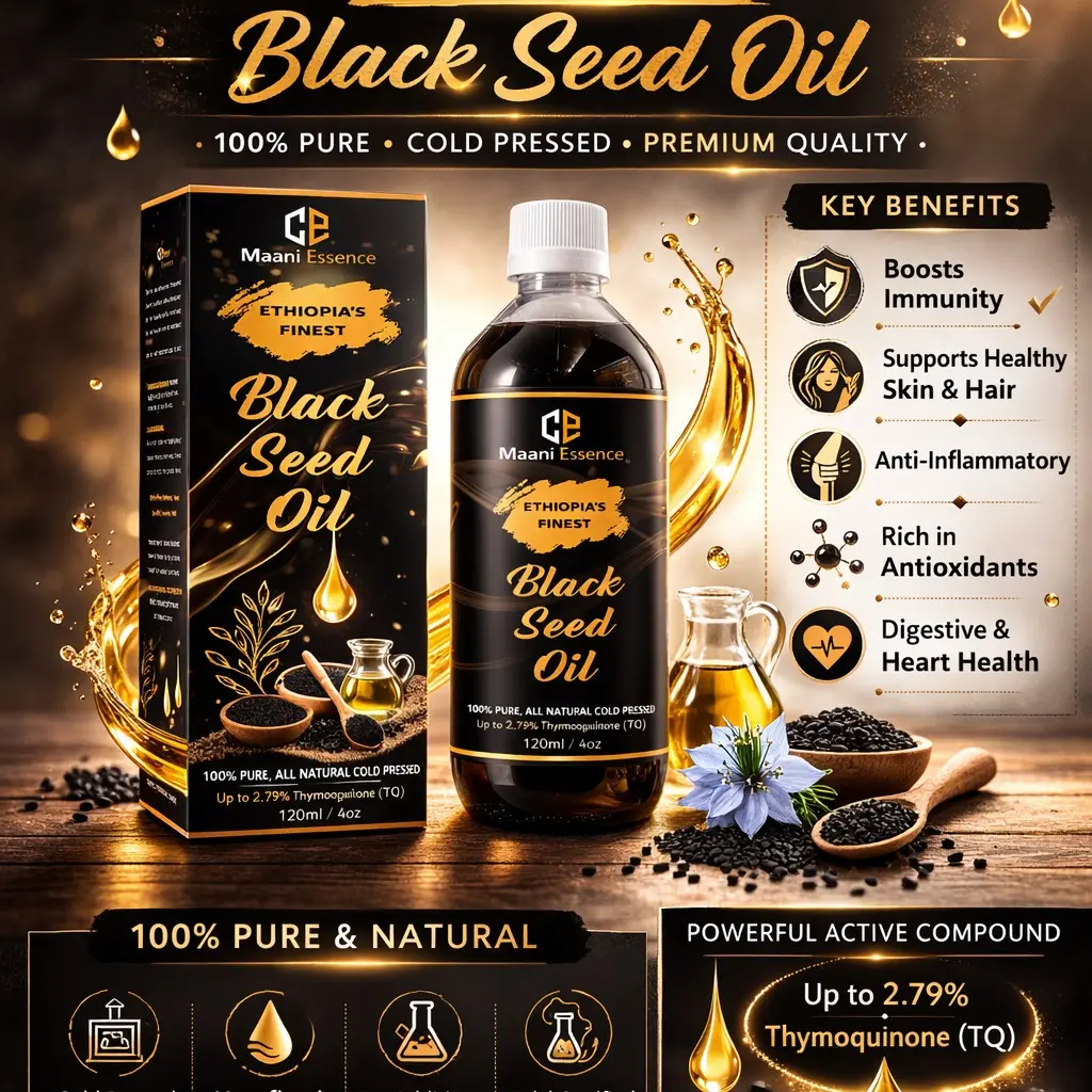 ·Experience the remarkable power of our 100% Pure Ethiopian Black Seed Oil, expertly extracted from premium Nigella Sativa seeds. Renowned for its high Thymoquinone content, this cold-pressed oil offers potent antioxidant and anti-inflammatory benefits, promoting radiant skin, healthy hair, and overall wellness. This versatile oil is perfect for both culinary and cosmetic uses, making it an essential addition to your daily routine. With its rich, nutty flavor, it enhances dishes while supporting immune function and digestion. Packaged in a dark glass bottle to preserve its integrity, our Ethiopian Black Seed Oil is a natural solution for those seeking holistic health benefits and beauty enhancement.