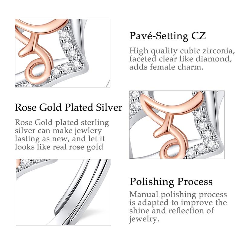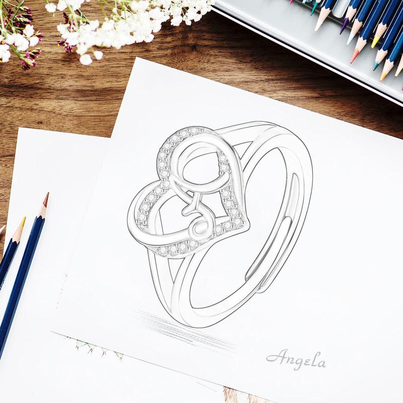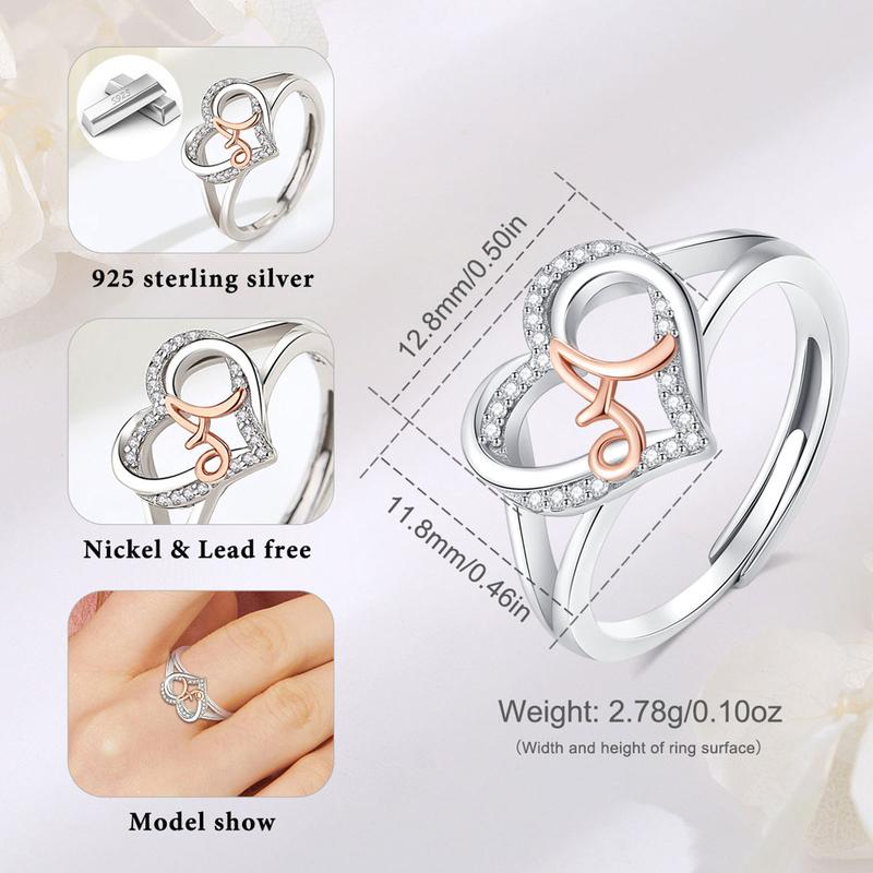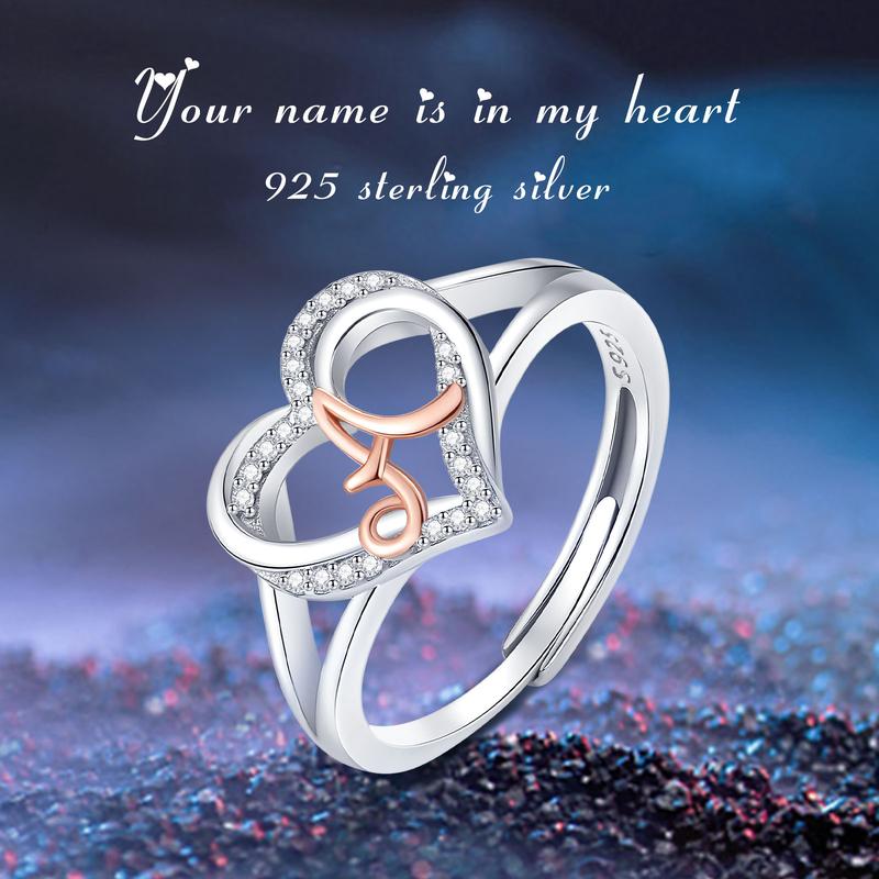 Express your individuality with this charming heart initial ring from Eudora.Expertly crafted from genuine 925 sterling silver, this elegant piece features a romantic open-heart silhouette adorned with shimmering pave-set cubic zirconia.At the center lies a beautifully scripted alphabet letter in a contrasting rose gold tone, offering a sophisticated two-tone aesthetic.The adjustable open-band design ensures a comfortable fit for any finger size, making it a perfect personalized accessory or a sentimental gift for birthdays, anniversaries, or special milestones.This versatile ring combines classic romance with modern customization, allowing you to carry a meaningful initial with timeless grace and brilliant sparkle.