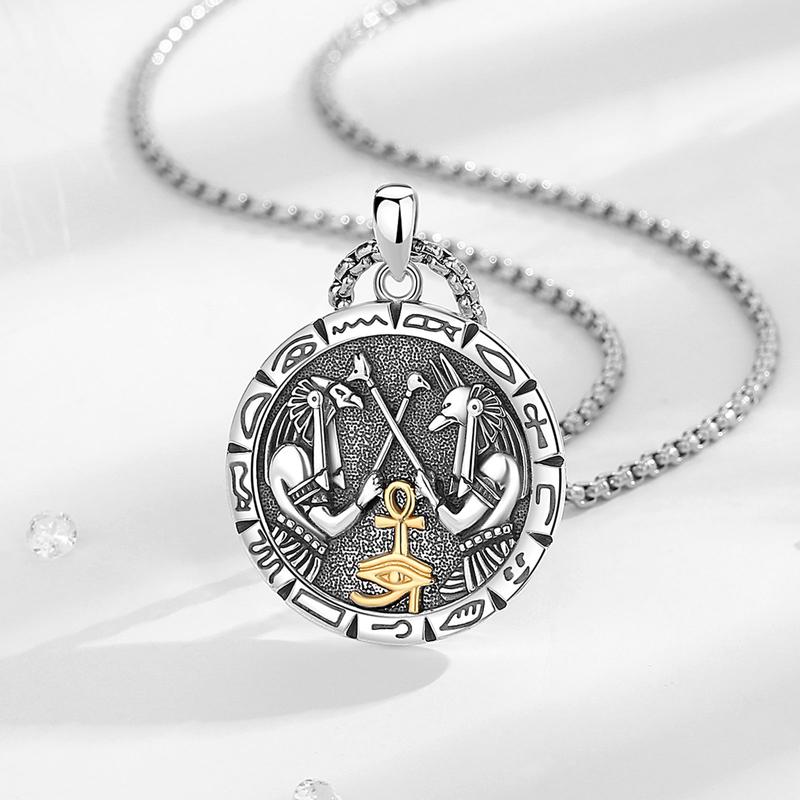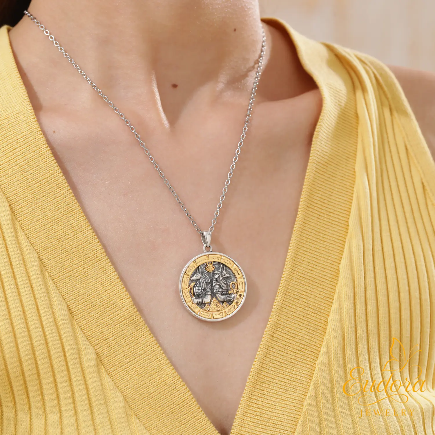 Horus and Anubis face each other with their staffs crossed, symbolizing mutual respect and power. This medallion represents the union of celestial and chthonic forces. The bold pendants symbolize strength, wisdom, and spiritual connection.
