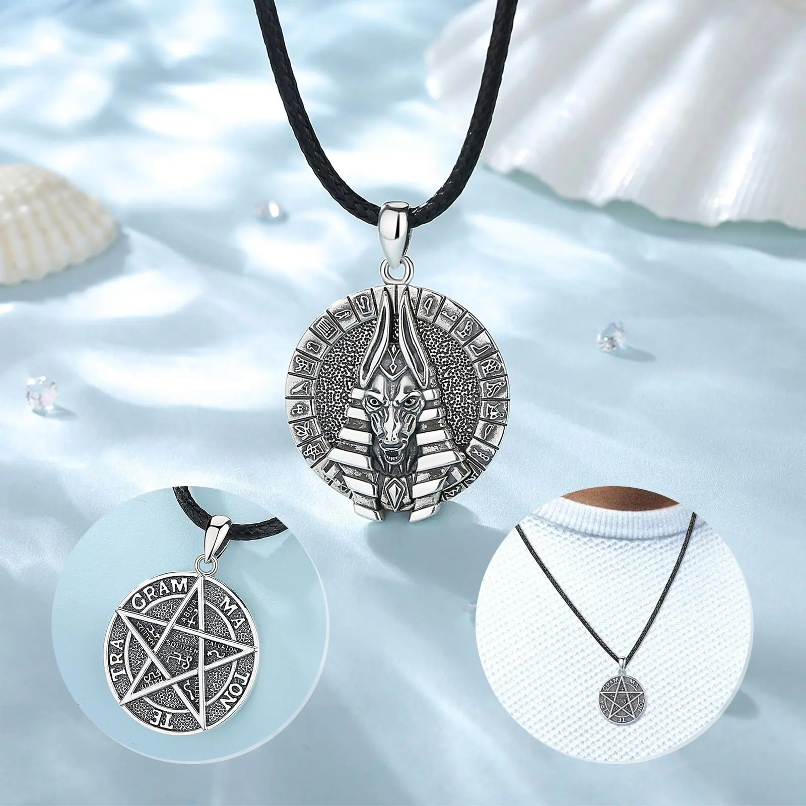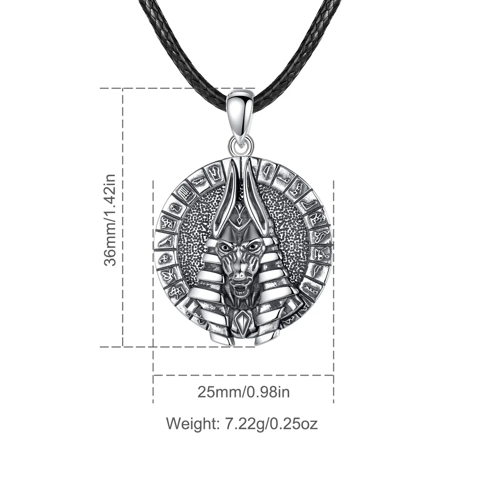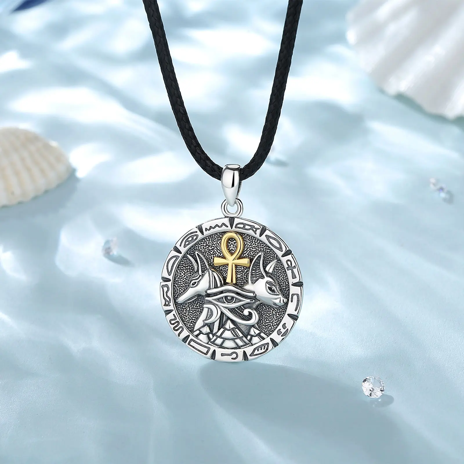 This double-sided medallion features two depictions of Anubis on the front and the sacred Ankh on the reverse. It represents the mysteries of the afterlife. The amulet is made from solid, hypoallergenic 925 Sterling Silver with a vintage oxidized finish. Rich, 18K Gold Plated accents enhance the Ankh, Eye of Horus, and Pyramids. Most designs come with a durable chain, ready for a powerful statement piece.