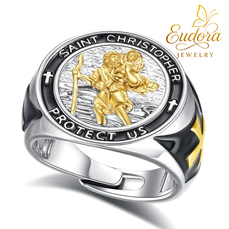 Embrace spiritual protection with the meticulously crafted Saint Benedict medal ring from Eudora. This vintage-style statement piece is made from silver-plated copper, featuring a specialized antiqued finish that highlights the intricate religious engravings. The design showcases the traditional San Benito medal, a centuries-old symbol of faith and guardianship, rendered with a powerful stereoscopic 3D effect.