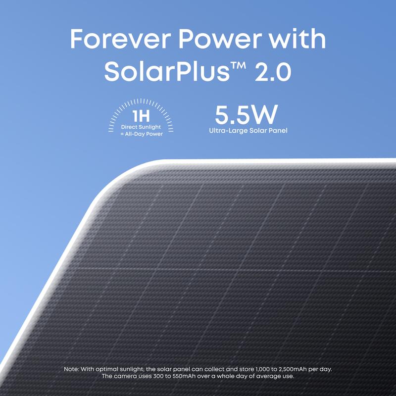 ·Powerful Solar-Charging with SolarPlus: Stay charged year-round with a 5.5W ultra-large solar panel and SolarPlus 2.0. Just 1 hour of direct sunlight a day keeps the camera running, and the detachable design makes setup easy and flexible.