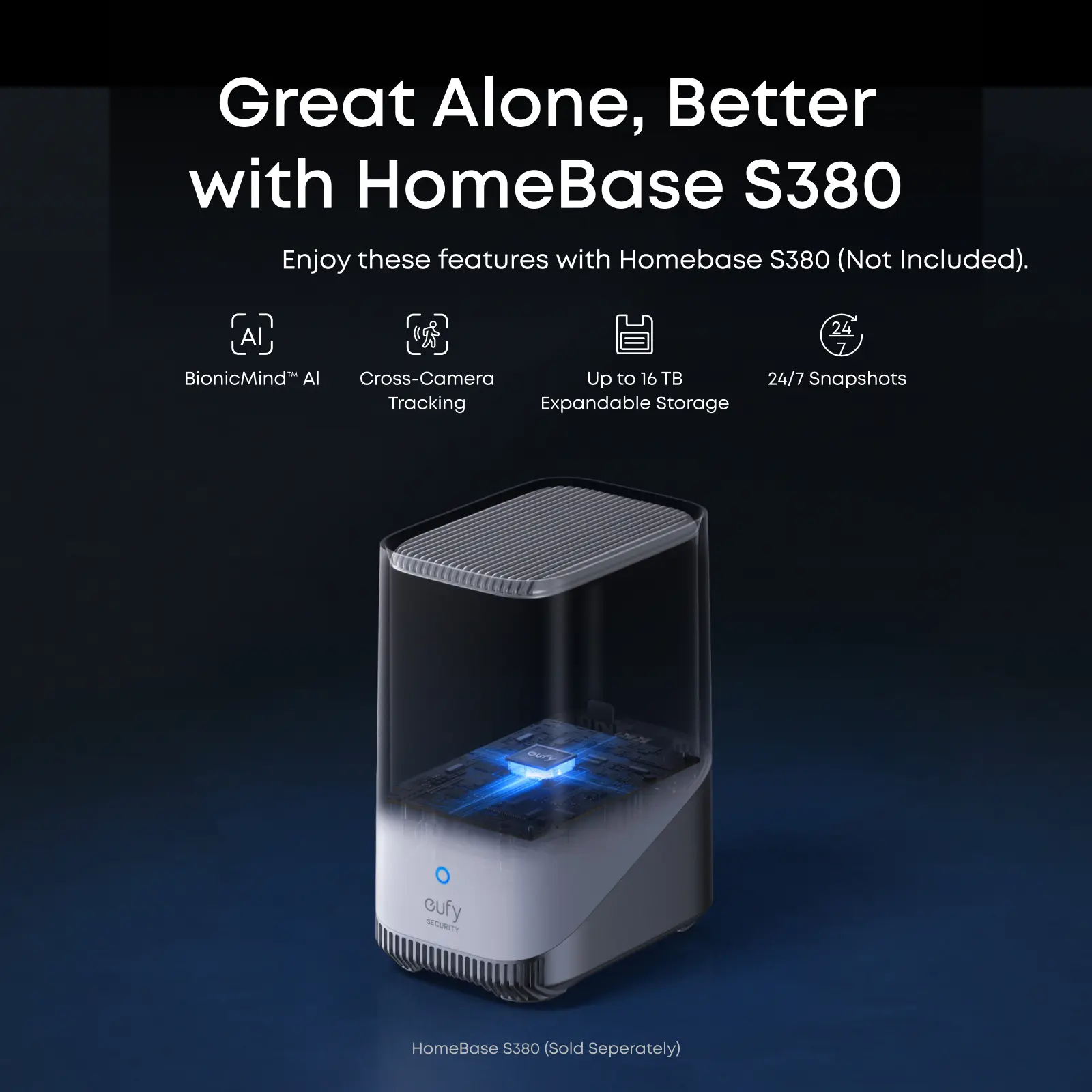 ·Better with HomeBase S380: Unlock BionicMind AI to differentiate family from strangers. With 16 GB built-in storage, expandable up to 16 TB, rest easy knowing your videos are stored securely. If you already own a HomeBase S380, please make sure it’s updated to version V3.7.2.6 or later, and your eufy app is updated to the latest version to enable 24/7 recording and Snapshot features.