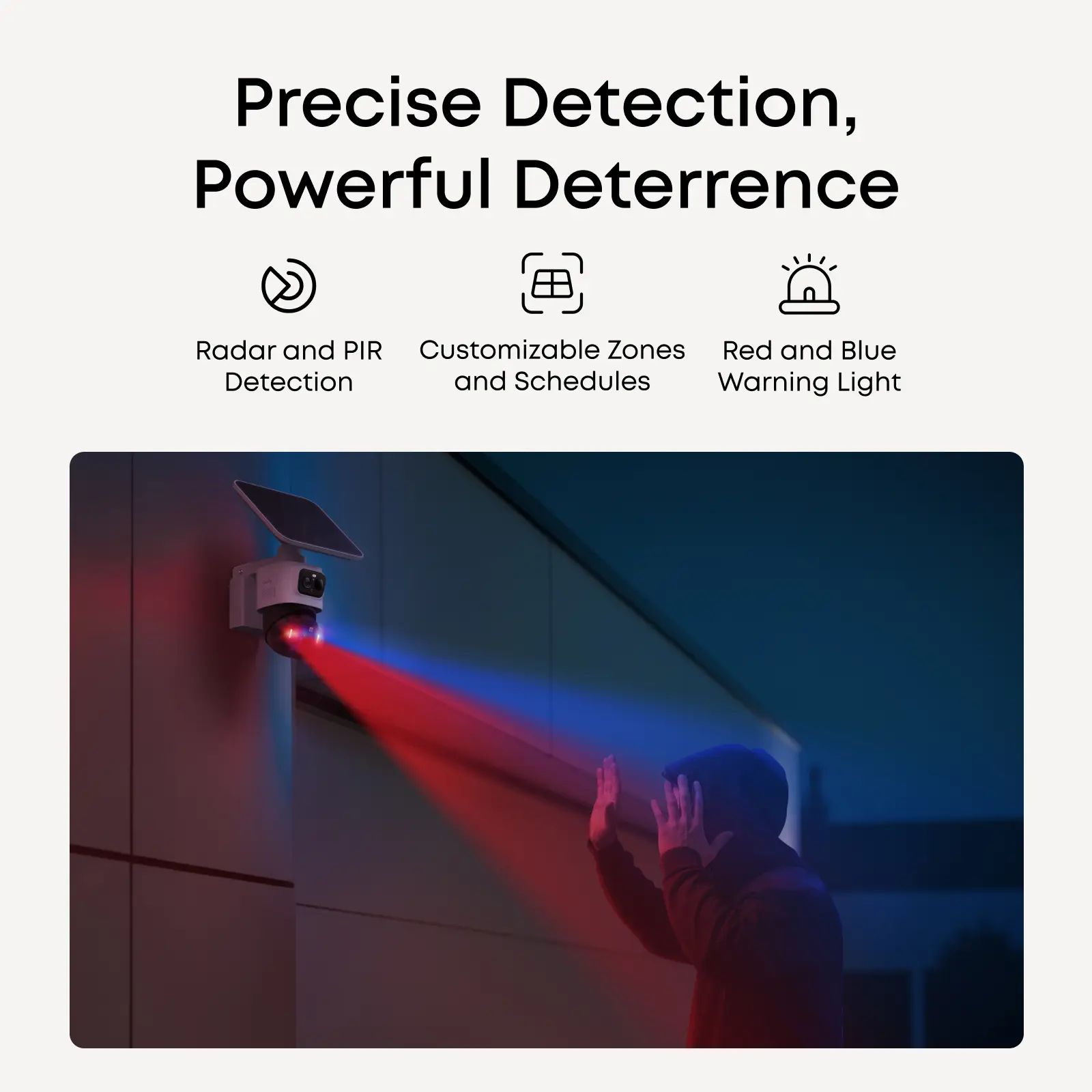 ·Precise Detection, Powerful Deterrence: Radar and PIR sensors deliver precise motion alerts with fewer false alarms. When a threat is detected within your set zone or schedule, red and blue warning lights and a 105 dB siren activate to deter intruders.