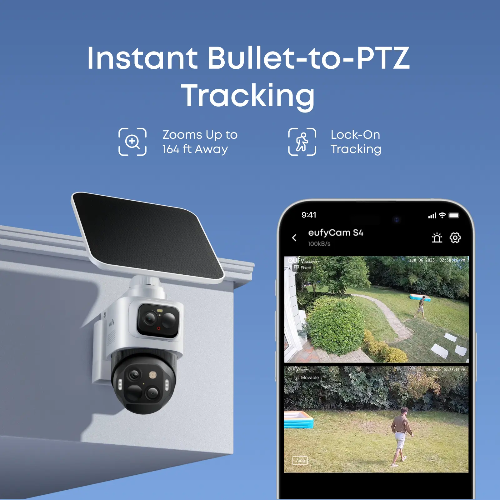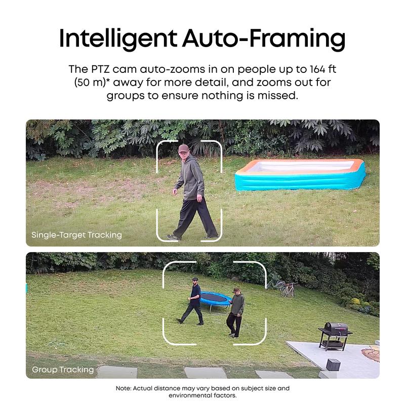 ·Bullet-to-PTZ Tracking and Auto-Framing: Once the bullet cam detects a subject, the PTZ camera instantly locks on, tracks, and zooms in to capture details up to 164 ft away. When more subjects enter the frame, it automatically zooms out to ensure they all stay visible.