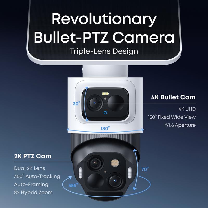 ·Revolutionary Triple-Lens Bullet-PTZ Camera: A single groundbreaking device that replaces and outperforms separate bullet and PTZ cameras. The upper 4K bullet lens delivers a 130° fixed wide view, while the lower 2K dual-lens PTZ offers 360° smart tracking and zoom.