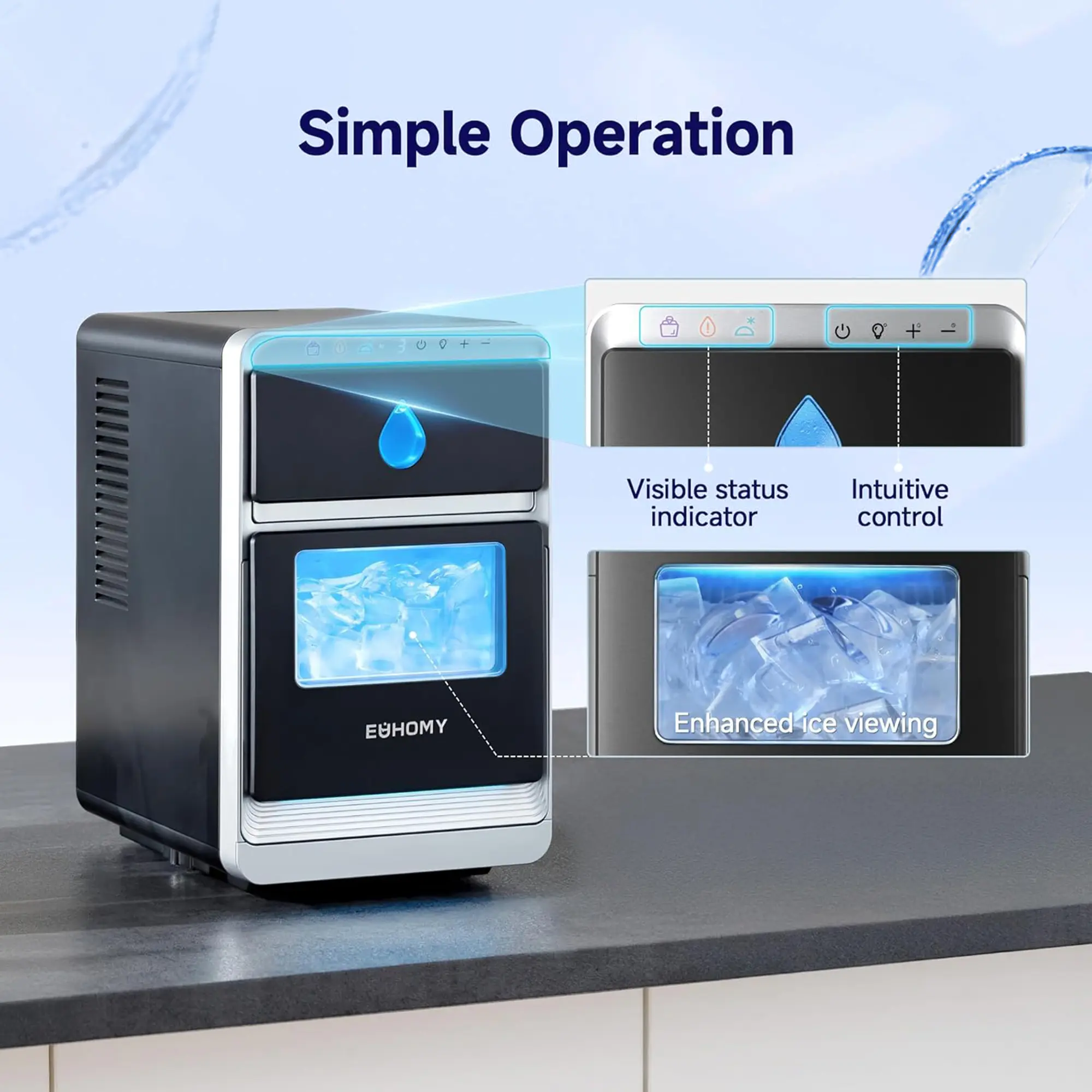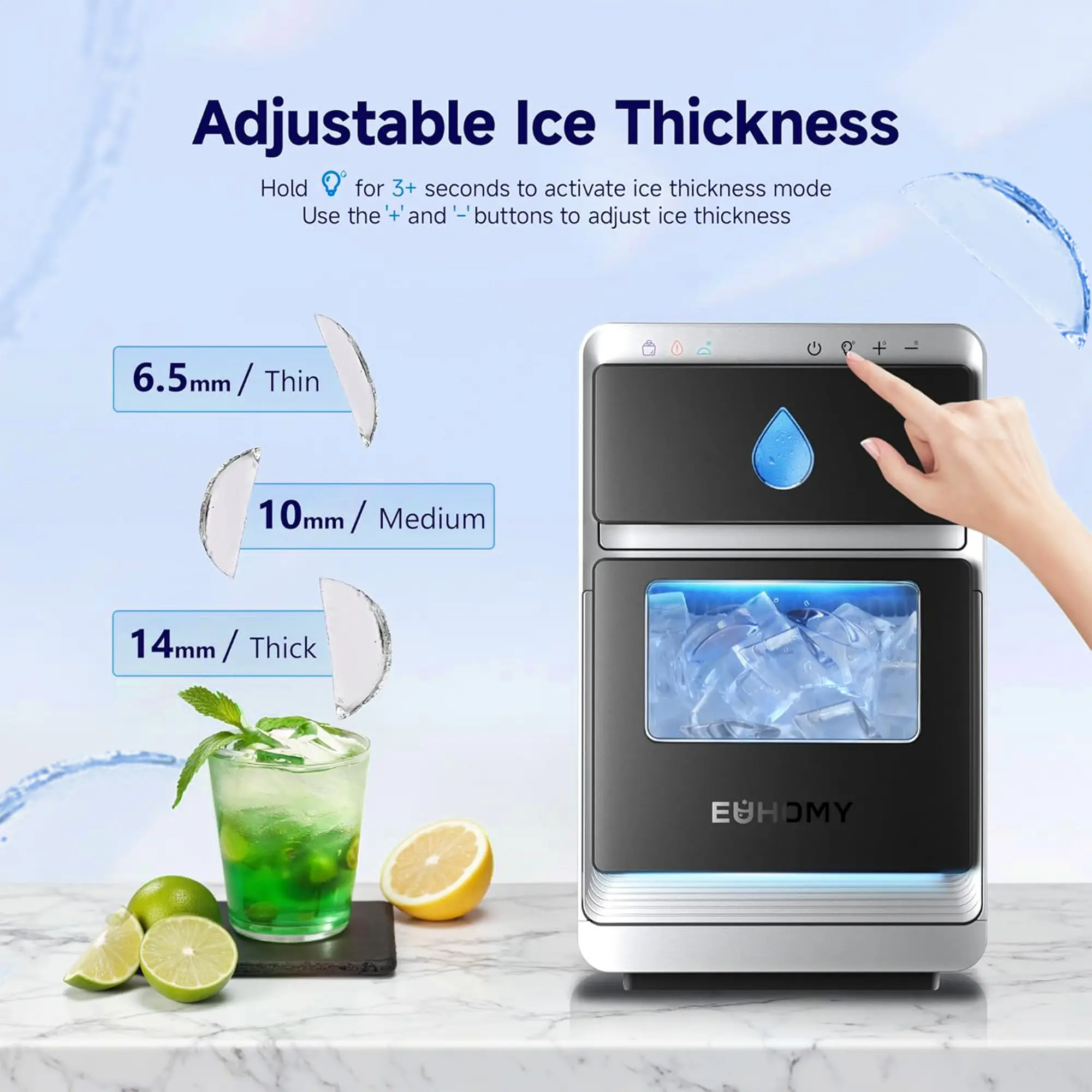 The transparent design allows easy monitoring of the water level and ice storage. Track the remaining ice-making time with an intuitive countdown display. Customize the thickness of the ice cubes from 6.5mm to 14mm, tailored for any occasion. Stay in control of your ice supply effortlessly.