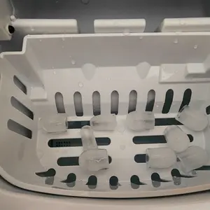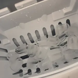 Cute little ice machine. The ice looks like ice bullets. They are made so quick. Perfect for your mix drinks on a warm day. The sound is not to bothersome. Easy set up. Price was perfect. Fit on my kitchen counter perfectly. Very happy. Had it for two days so far.