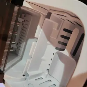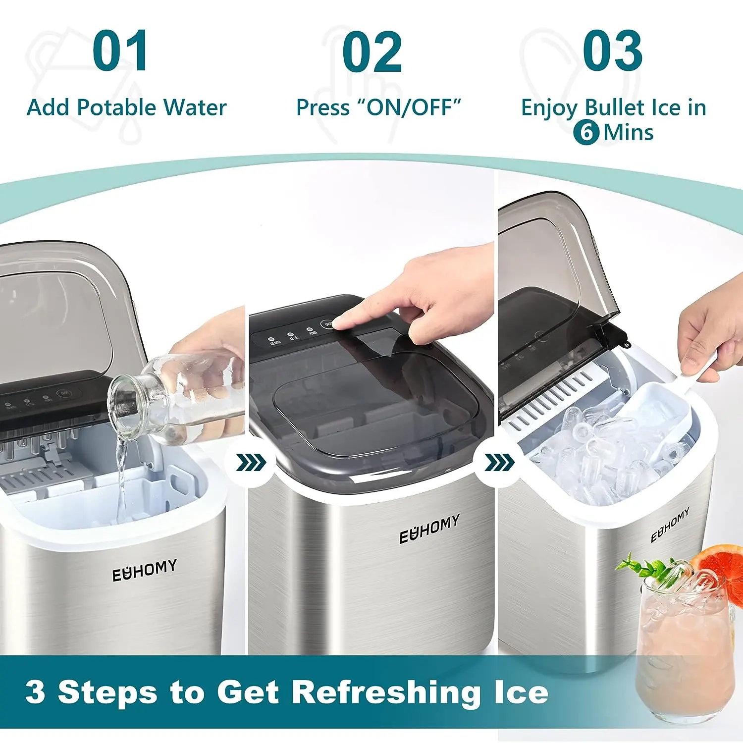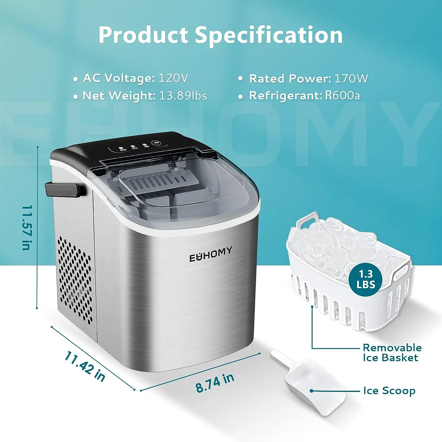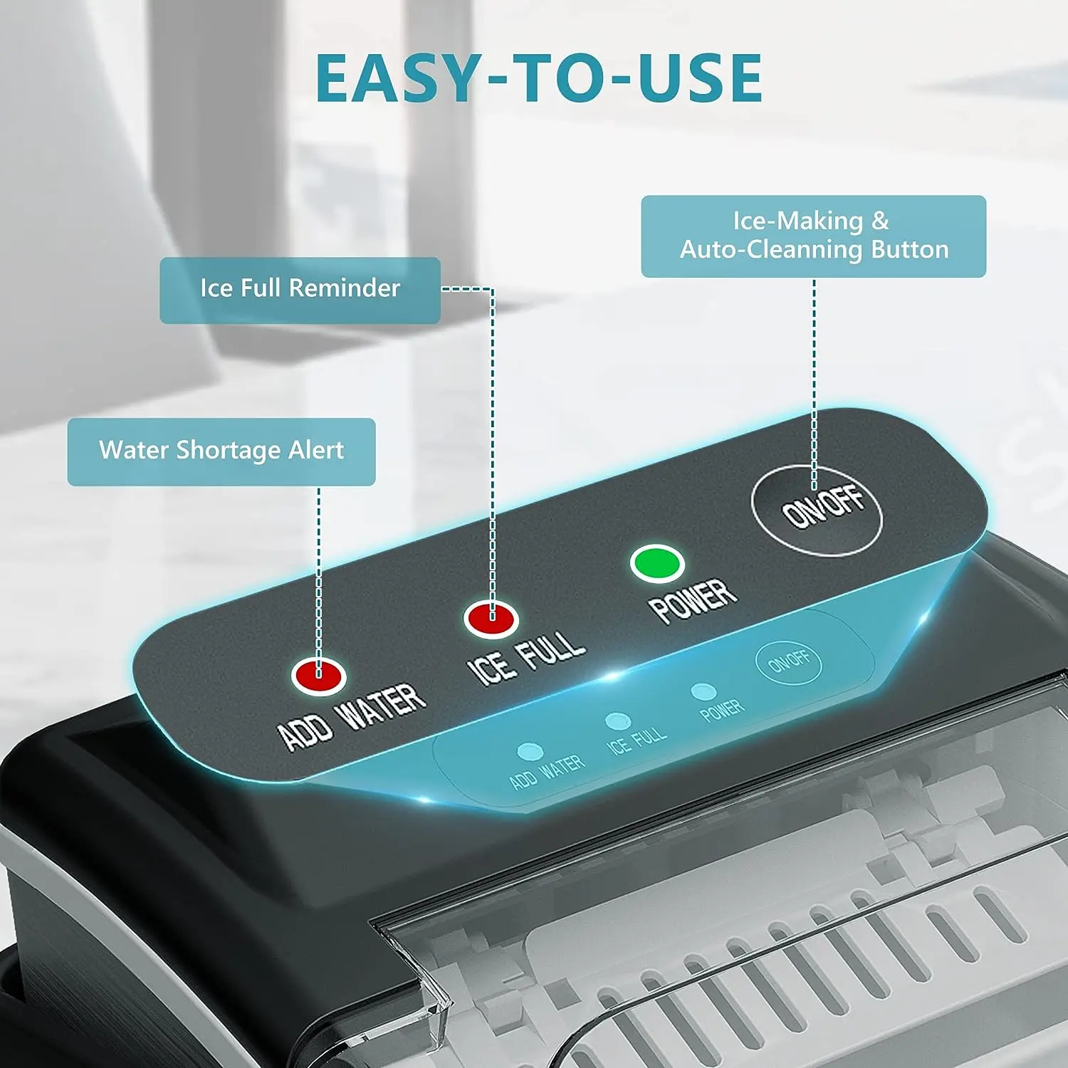 Easy to unbox, clean and set up. I love that it has a self cleaner and plug to drain on bottom. It makes ice in 6 mins. It has a basket and scoop for ice.
