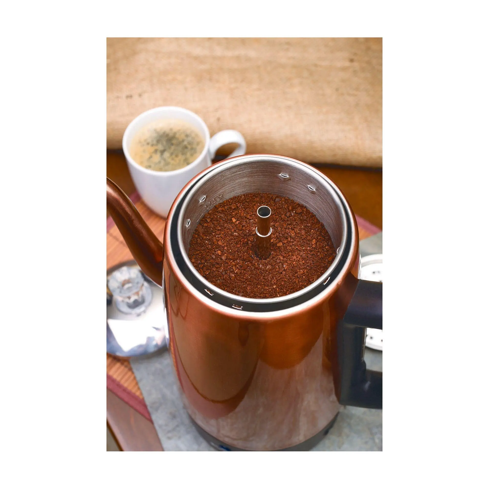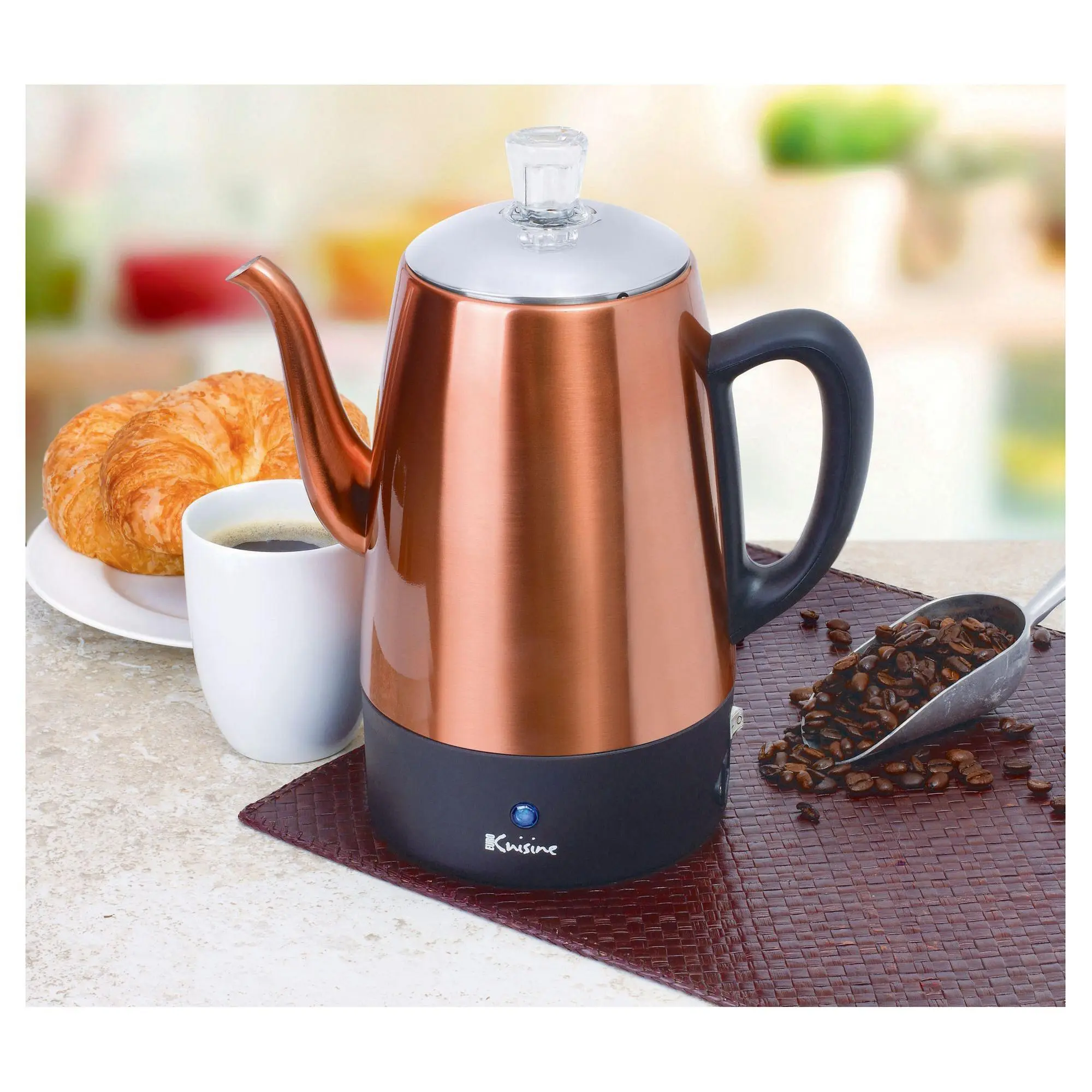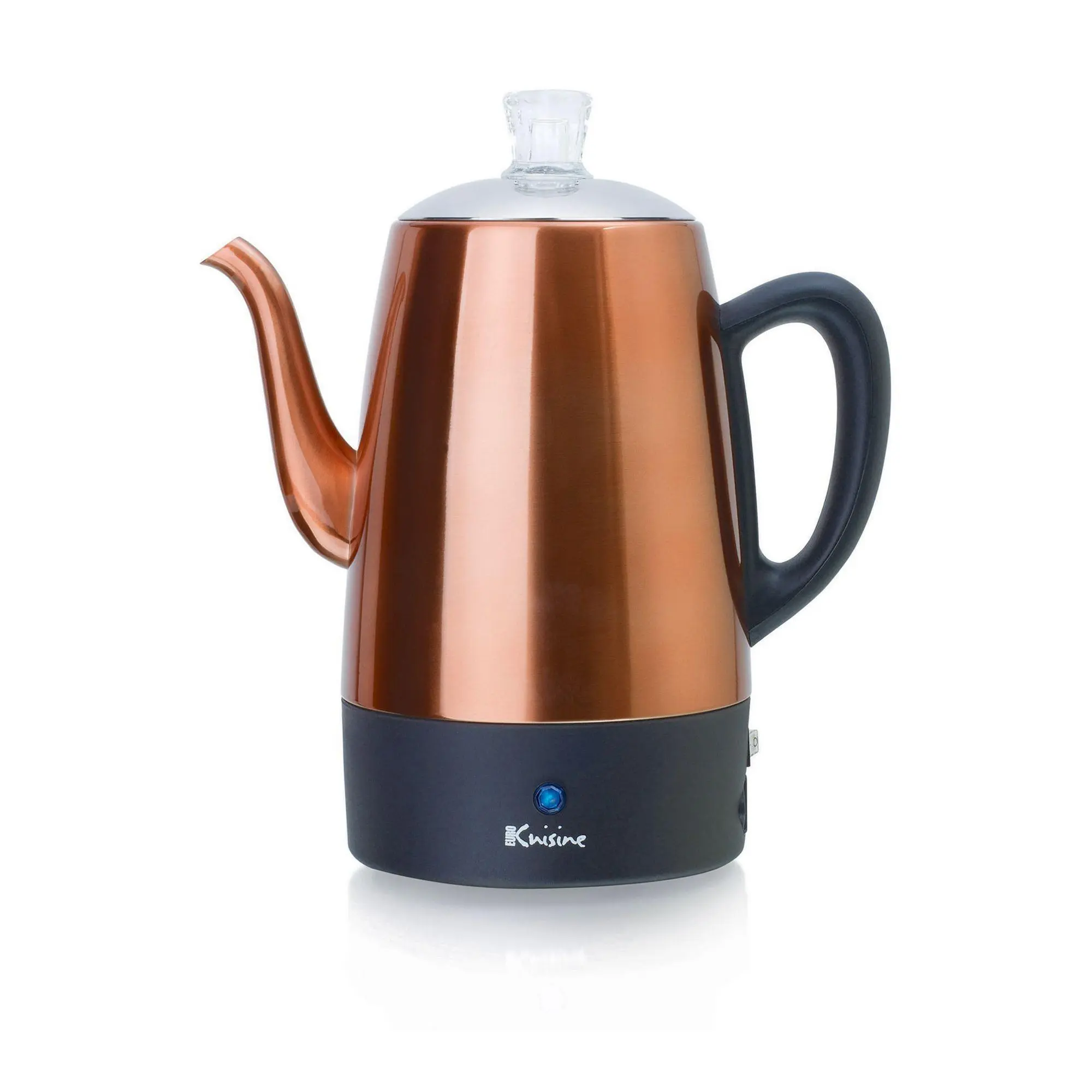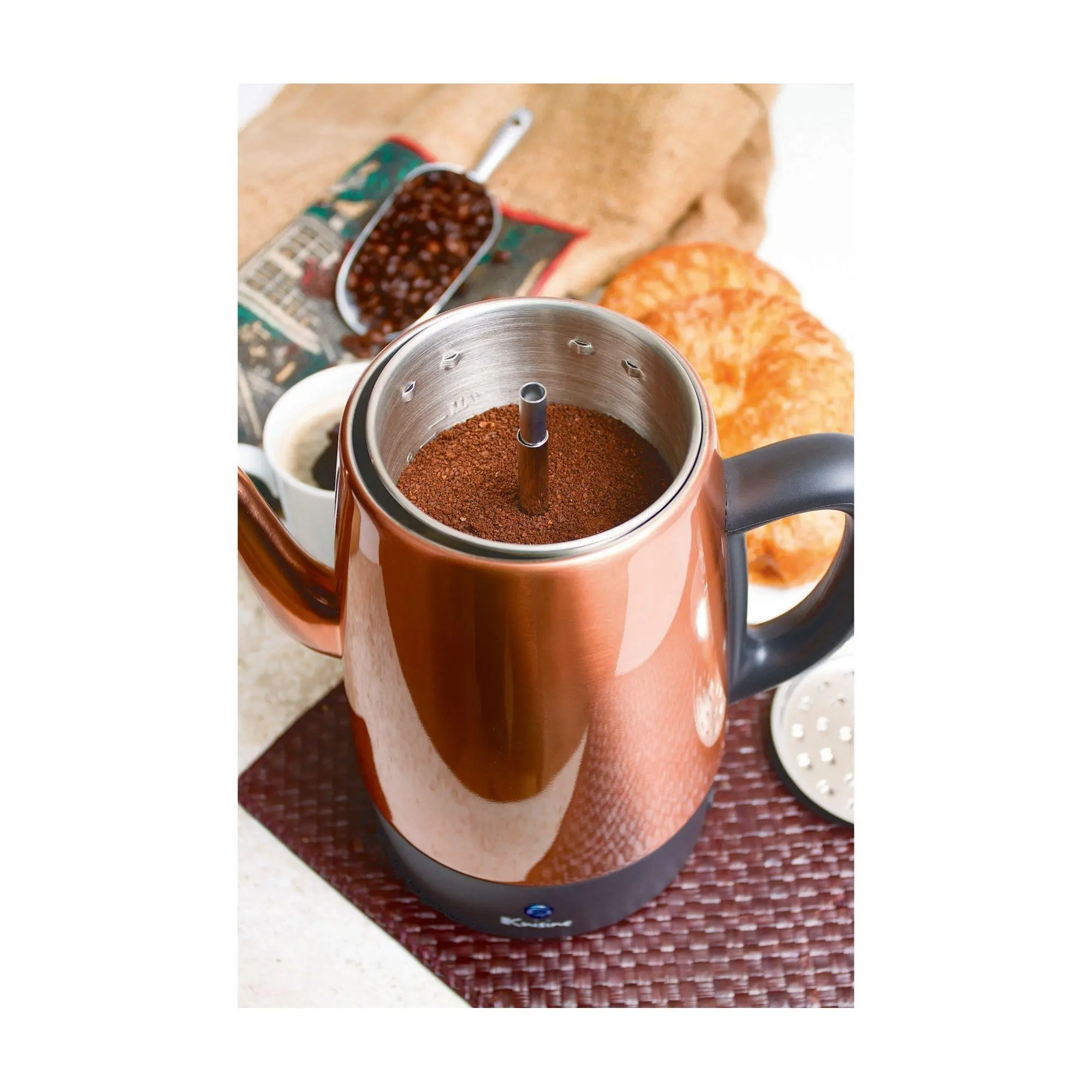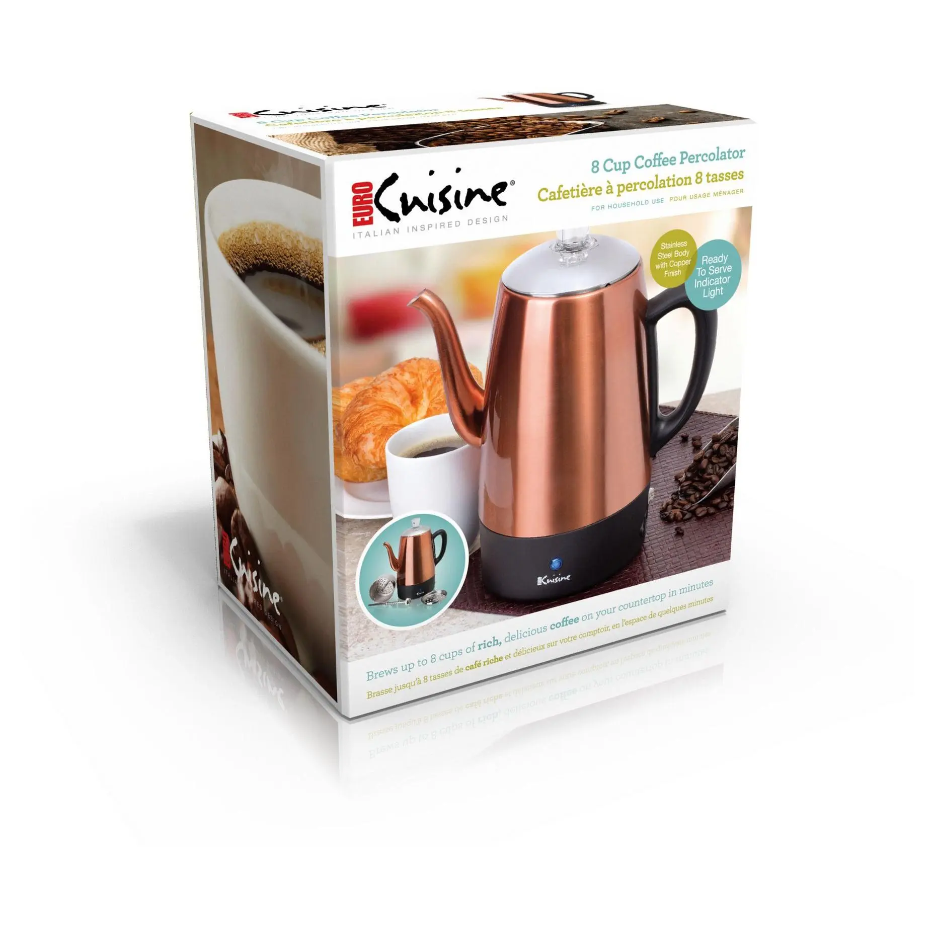 Add a splash of retro-inspired style to your coffee routine with this beautiful percolator, featuring a copper-colored exterior, a stay-cool base for serving, and a classic glass knob. From Euro Cuisine.