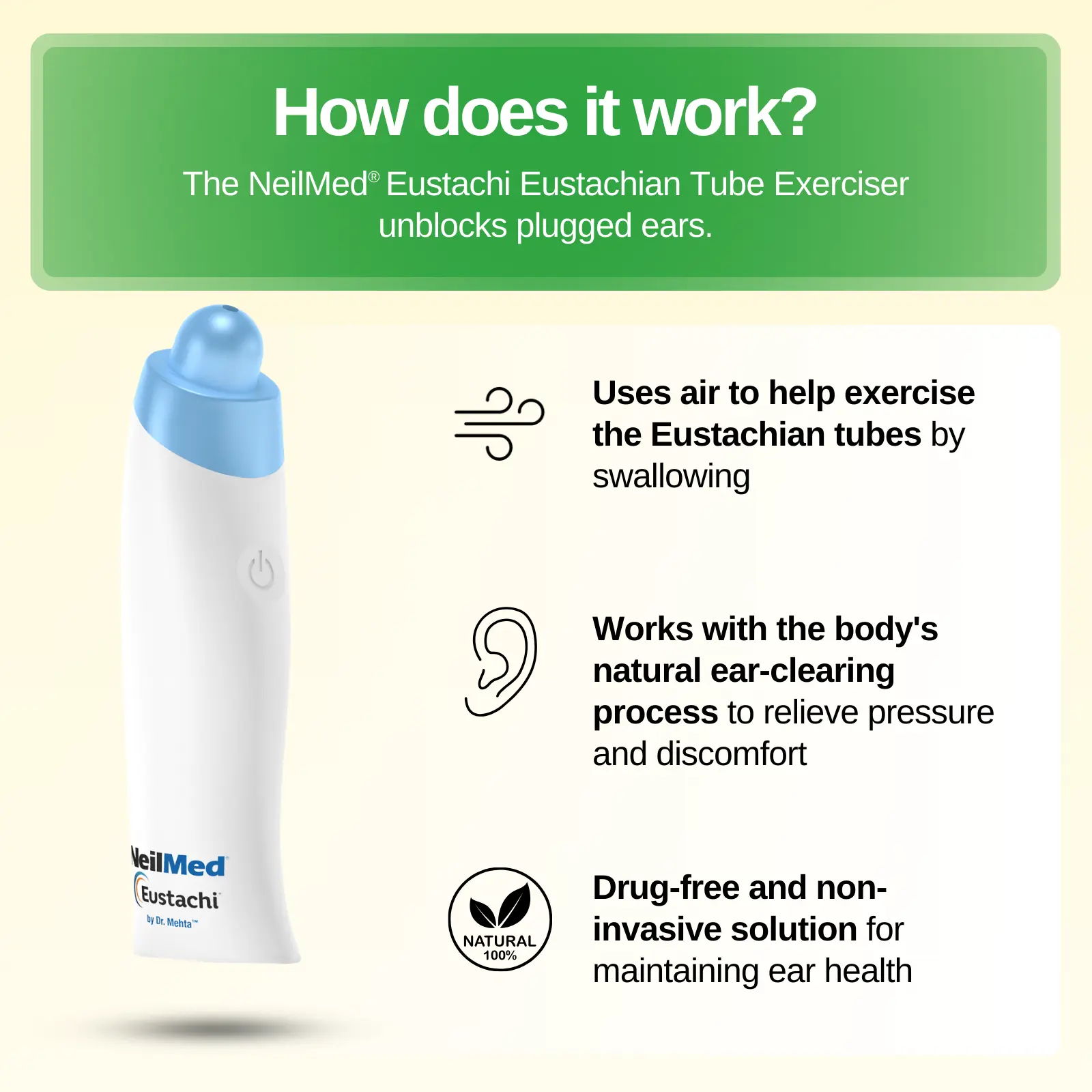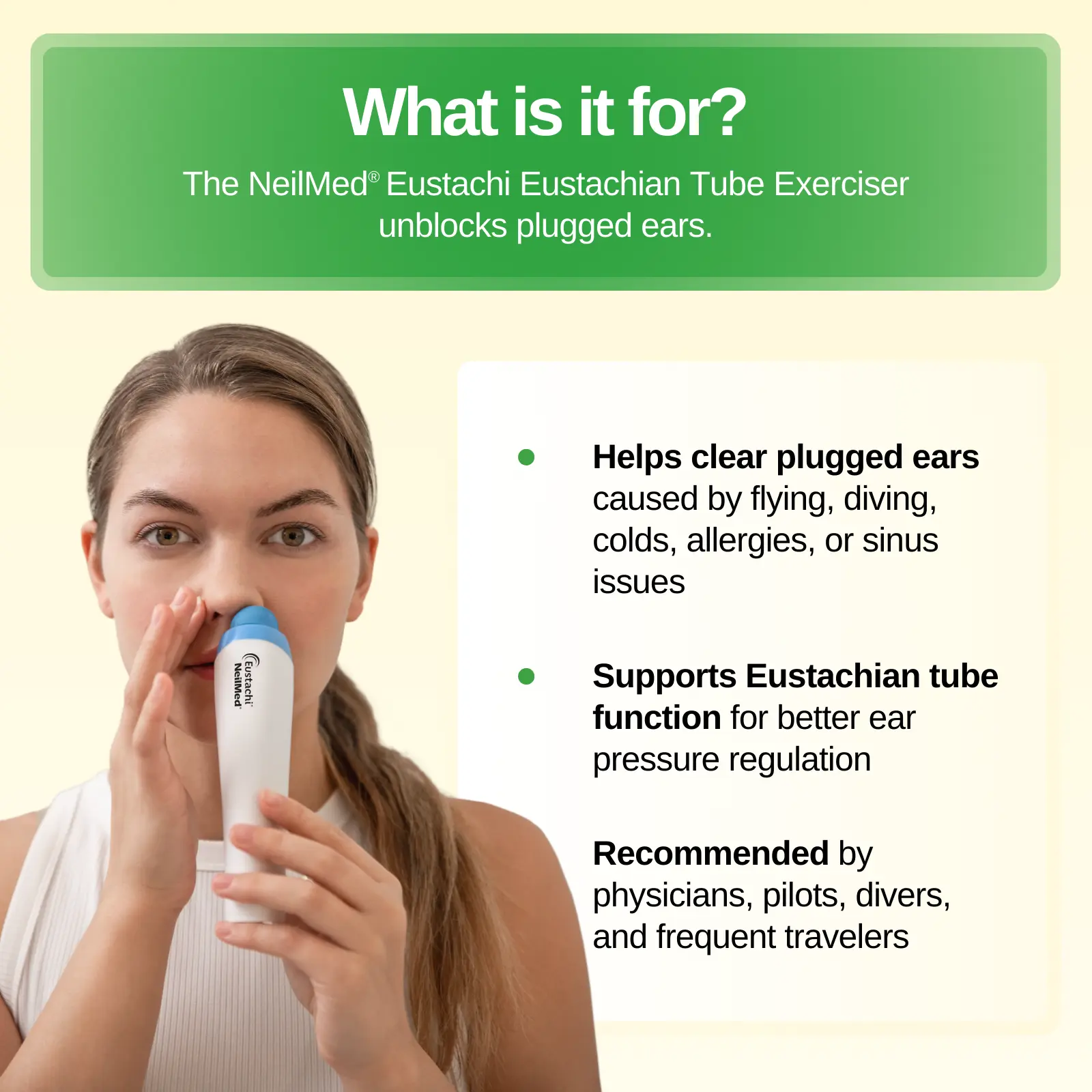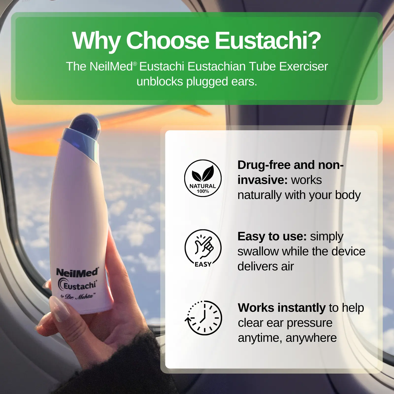 Eustachi unblocks plugged ears by helping exercise the eustachian tubes; all you have to do is swallow! It's quick, safe, and easy to use. Eustachi works with your body's natural mechanism for clearing your ears. Swallowing and yawning normally clear your ears. When swallowing isn't enough, the Eustachi helps using just a little air. Recommended and used by physicians, parents, chiropractors, airline pilots, scuba dive instructors, cold and allergy sufferers, and more.