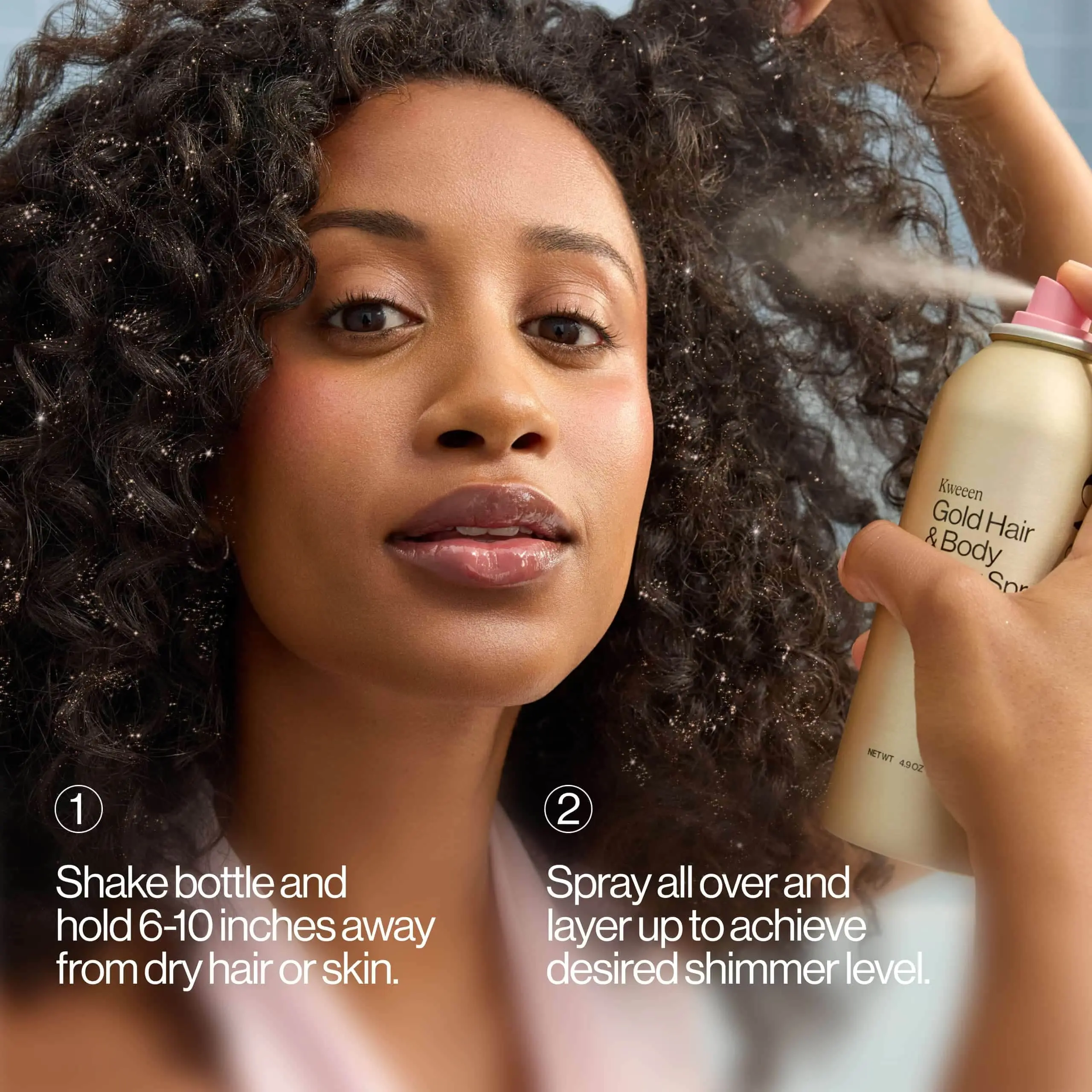·Hold 6-10 inches away from dry hair or skin, spraying all over for sparkles