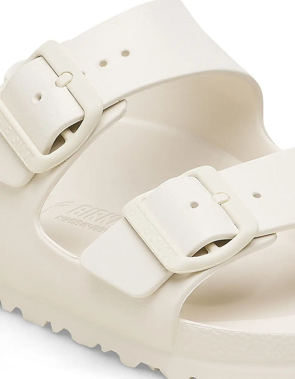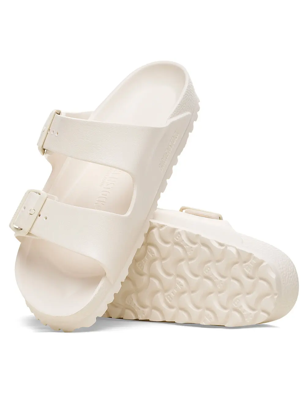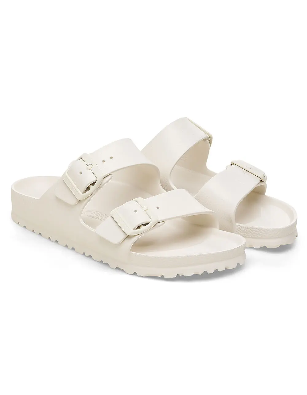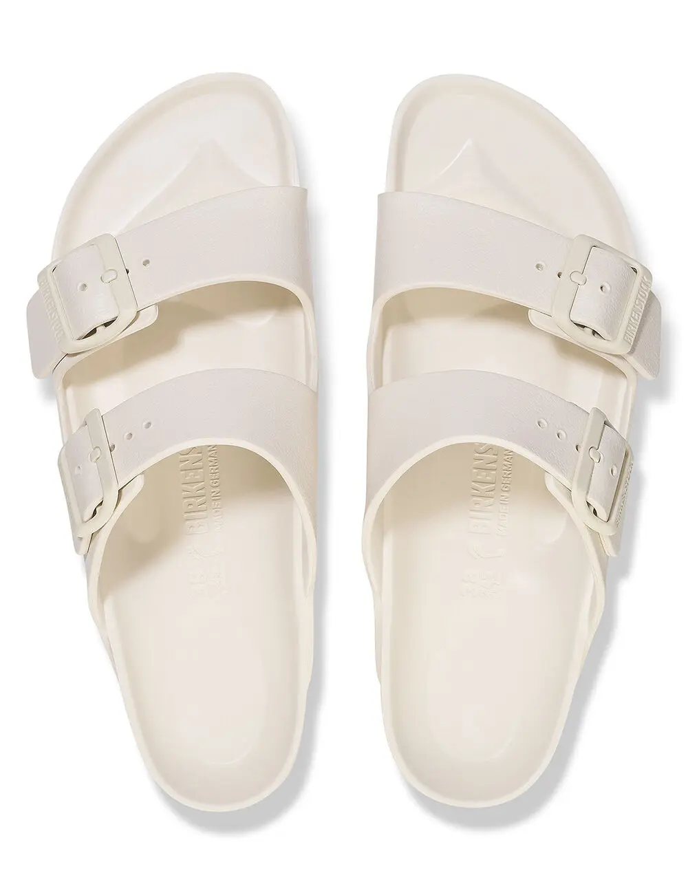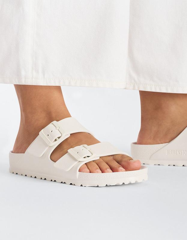 Birkenstock Arizona Essentials EVA Sandals. The legendary two-strap design from Birkenstock - the Arizona. Modeled on the cork original, this sandal is made from ultra lightweight and highly flexible EVA. These sandals are shock absorbing, waterproof, and skin-friendly. Wear them at the beach, in the garden, or around the gym and after workouts. It's the perfect addition to your classic Birkenstock sandals. Anatomically shaped Birkenstock footbed made from EVA. Upper/lining/sole: one piece molded EVA. Two straps, each with an individually adjustable pin buckle; waterproof, washable, ultra lightweight. Imported.