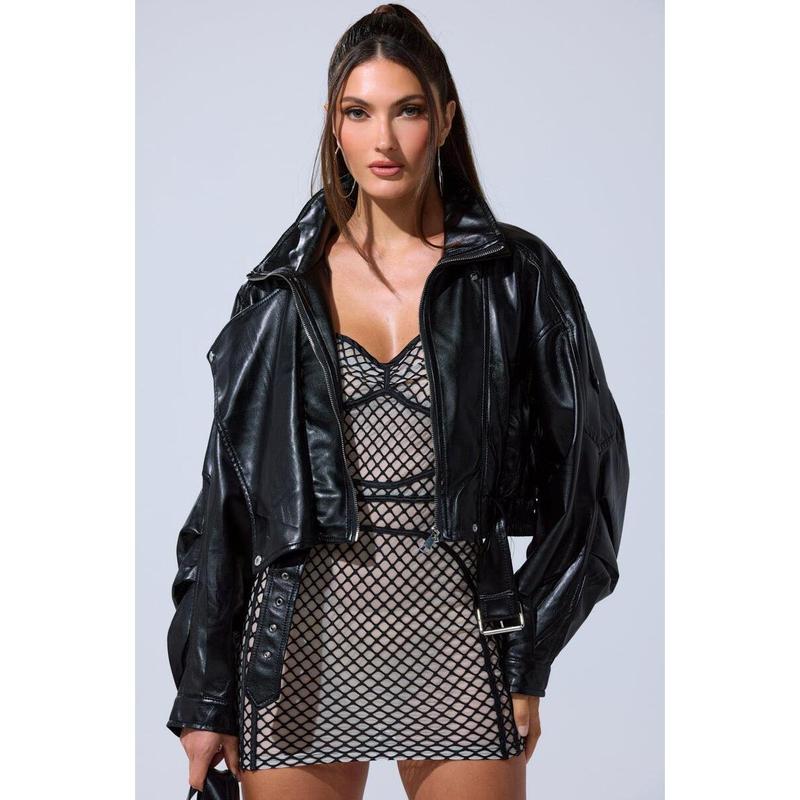 Swag: the sequel. The AKIRA Label Eva Slouchy Moto in Black adds an extra dose of it-factor to the classically cool leather jacket. Crafted from supple vegan leather, it features a cropped, oversized fit, a high moto collar, roomy button-cuff sleeves with ruched detailing, snap-button shoulder epaulets, roomy waist pockets, and a shirred, stretchy waistband with an attached belt. Complete with sleek interior lining, silver-tone hardware, and a layered front design with a snap-button front closure atop a standard zipper closure.- Shell: 100% PU, Base: 100% Polyester, Lining: 100% Polyester- No Stretch- Imported(all measurements approximate from size small)- 17” Shoulder to Hem- 20” Shoulder to Shoulder- 25” Sleeves- Model is 5’9” and wearing a size smallProduct ID: 1066514(all measurements approximate from size 1X)- 21” Shoulder to Hem- 22” Shoulder to Shoulder- 28” SleevesProduct ID: 1066518