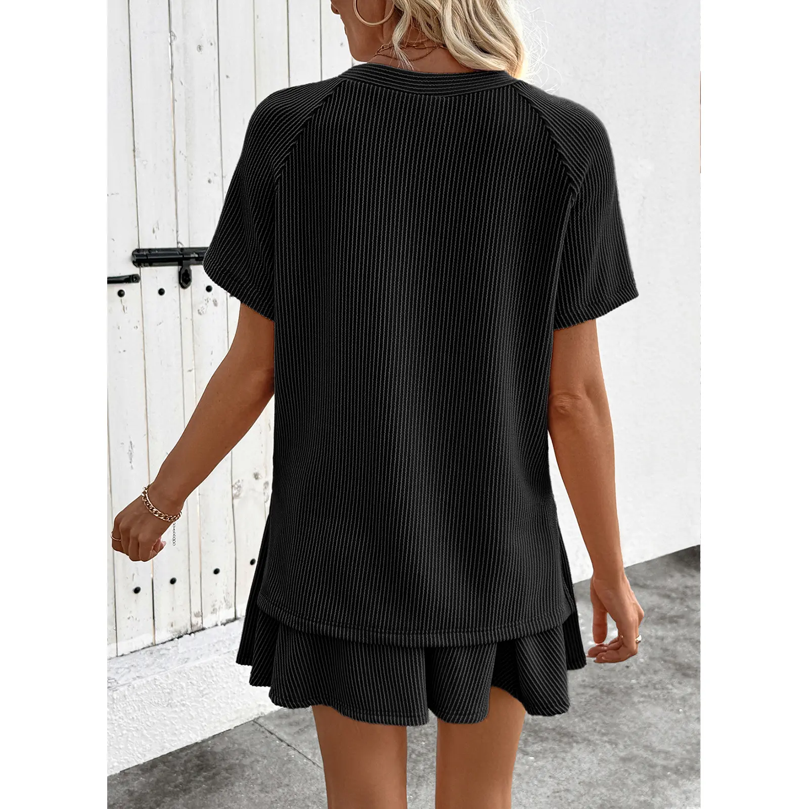 ·The top features a ribbed knit short sleeve design.