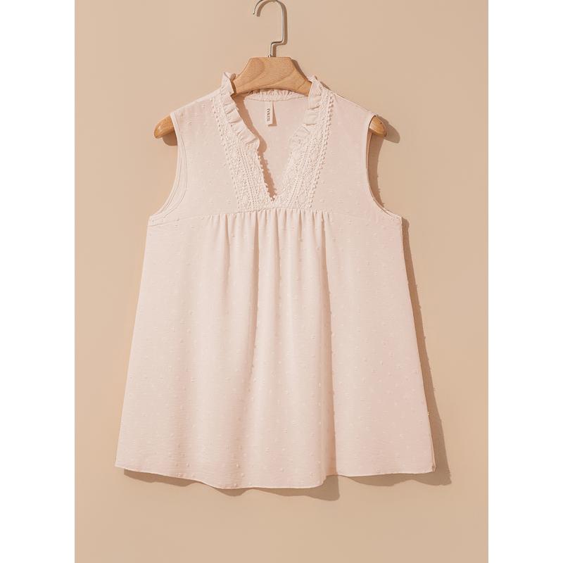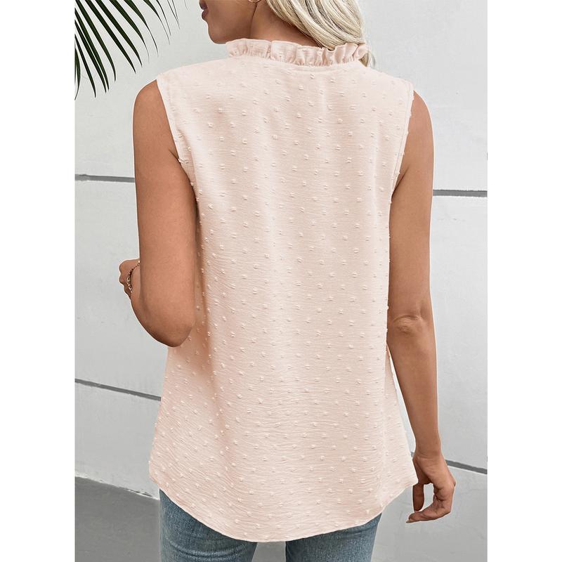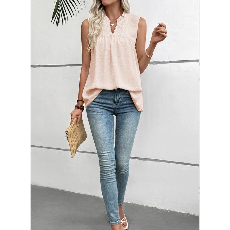 This women's V-neck sleeveless top is made of 100% polyester woven fabric. It is soft, breathable, and lightweight, ensuring all-day comfort. Perfect for the warm days of spring and summer. The material provides a comfortable fit, ideal for casual wear.