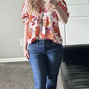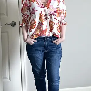 Love the fit and style of this shirt!! Print looks a little different in person, so I took a close up of the flowers. Still a nice print