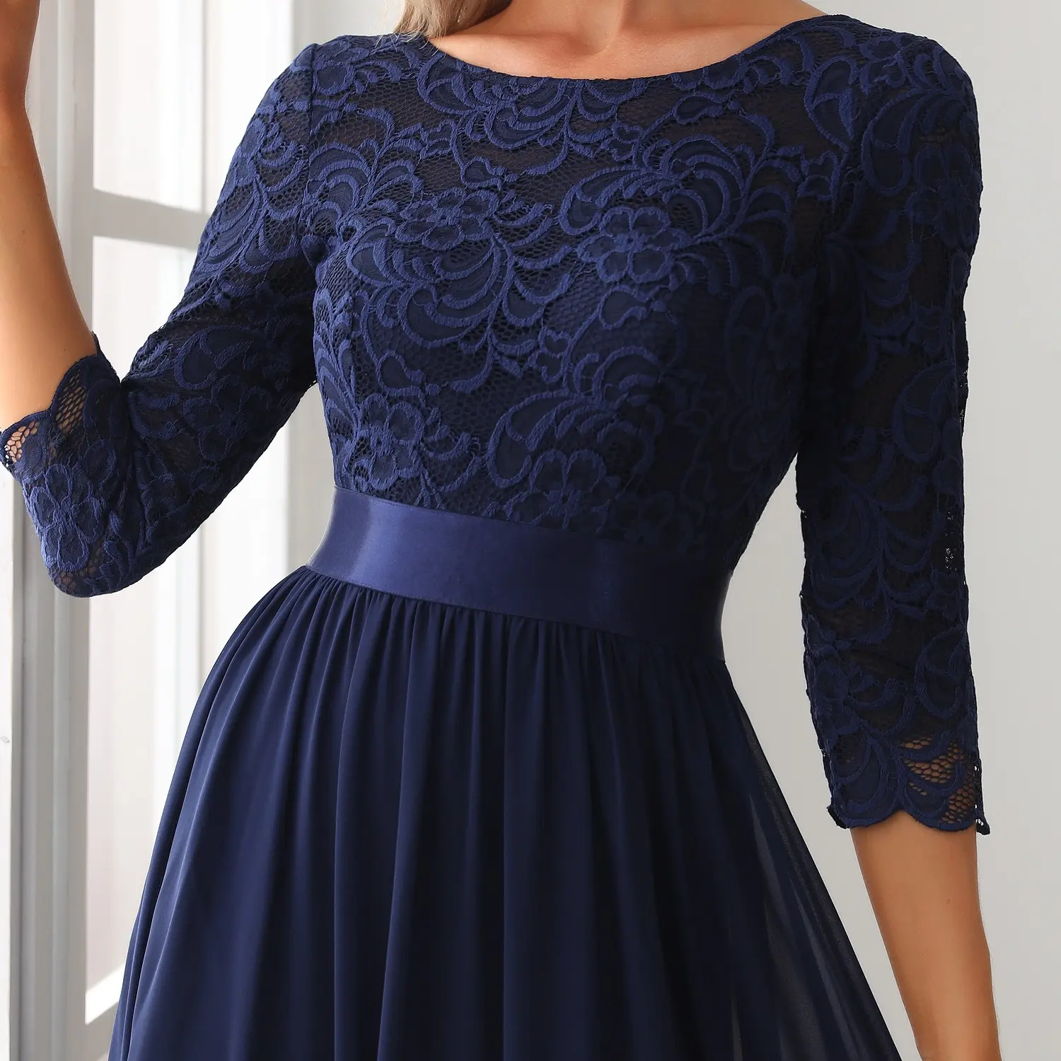 ·Lace Bodice & Sleeves: The dress features a lace bodice and sleeves, adding a touch of elegance and sophistication.
