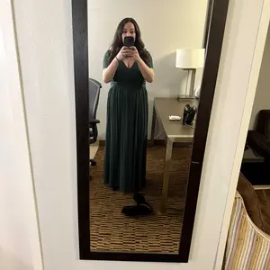 This is a beautiful dress. I’m a plus size girl. The fabric is forgiving. It’s long. I’m 5’9” and the dress covers my feet. Buy it. You won’t regret it.