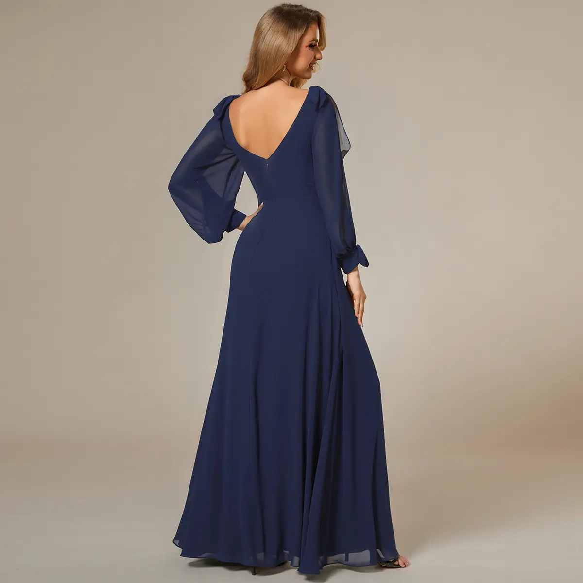 Elevate your wardrobe with the Ever-Pretty Autumn Navy Blue Maxi Dress. This elegant piece features a V-neck design, long sleeves, and a floor-length ruched chiffon fabric. Perfect for formal occasions, it includes a side slit for added flair. Ideal for mothers, teachers, or students heading back to school. Code: 80116.