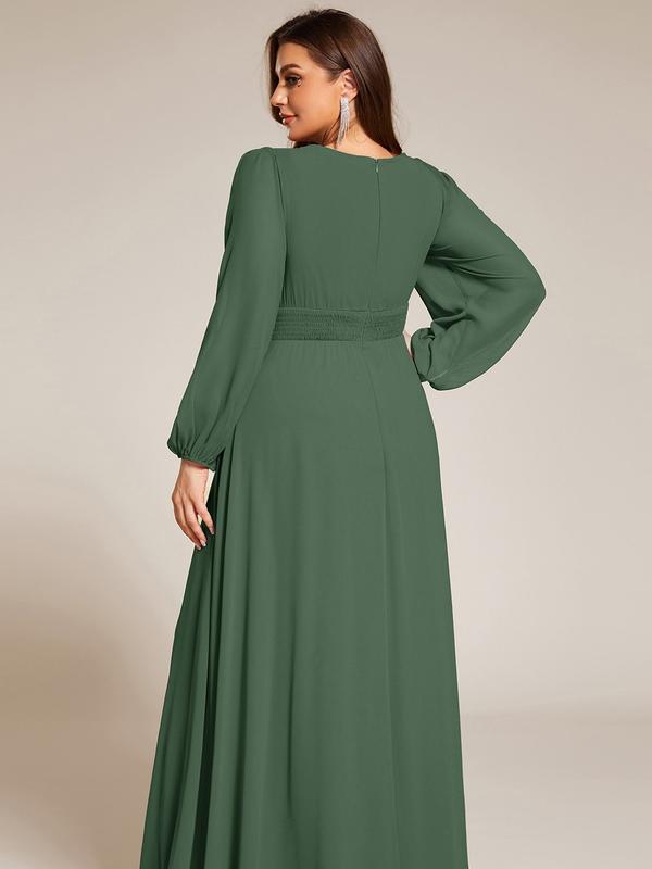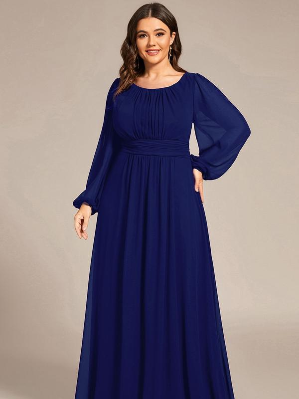 This romantic chiffon lantern sleeve Empire Waist Ruched mother of the bride dress leaves a lingering impression of elegance. Featuring sheer puffed long sleeves, a cinched empire waist, and flattering ruching, making it perfect for an outdoor wedding. The A-line floor-length silhouette can be paired with metallic, black, white, and nude heels.