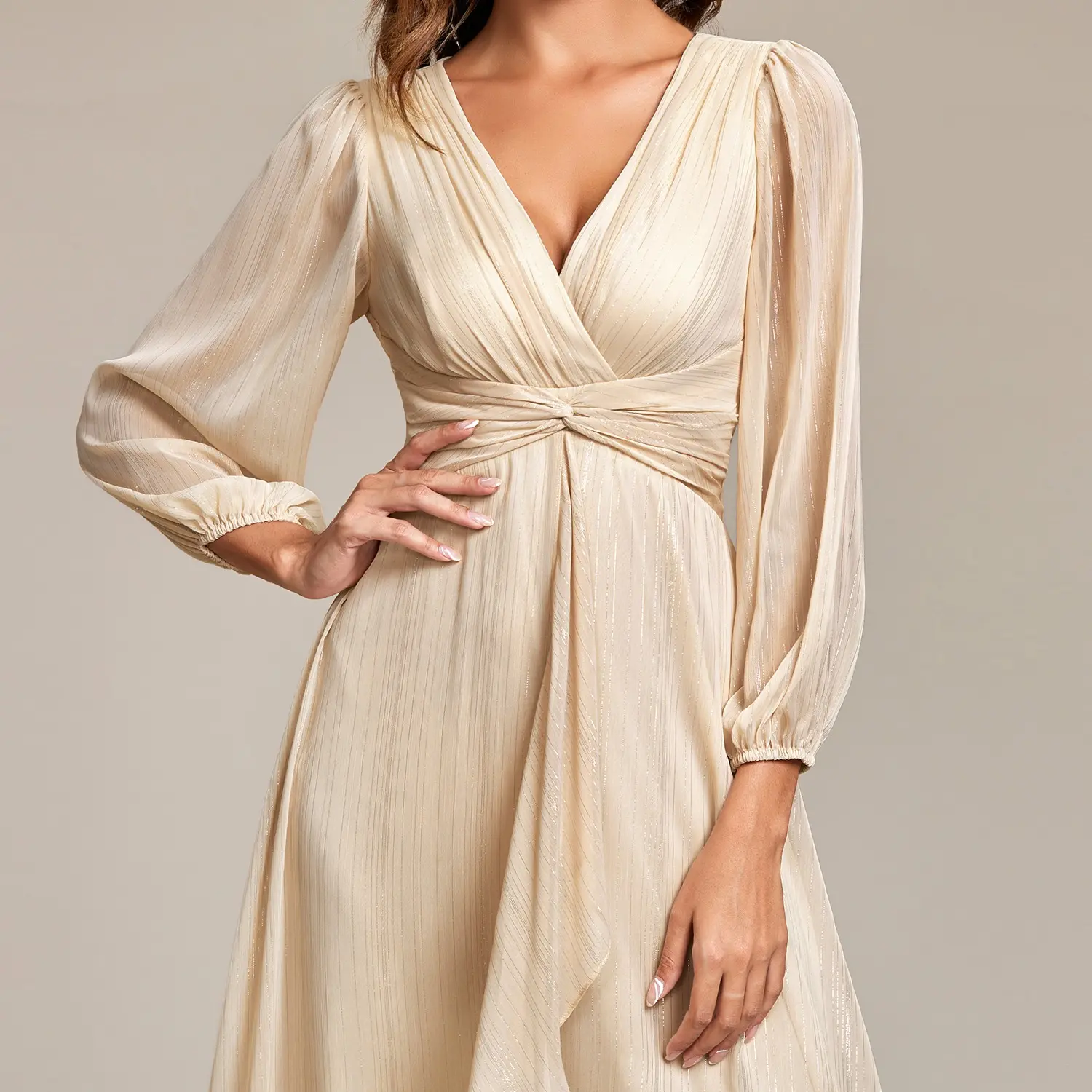 The dress arrived. It’s beautiful, I loved it!. It’s a little loose, but I’ll ask someone to fix it and tighten it where it’s too wide. The fabric is delicate and wrinkles easily. To remove those creases, it’s necessary to use a steam iron so the dress doesn’t melt.