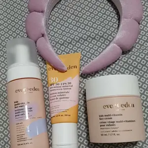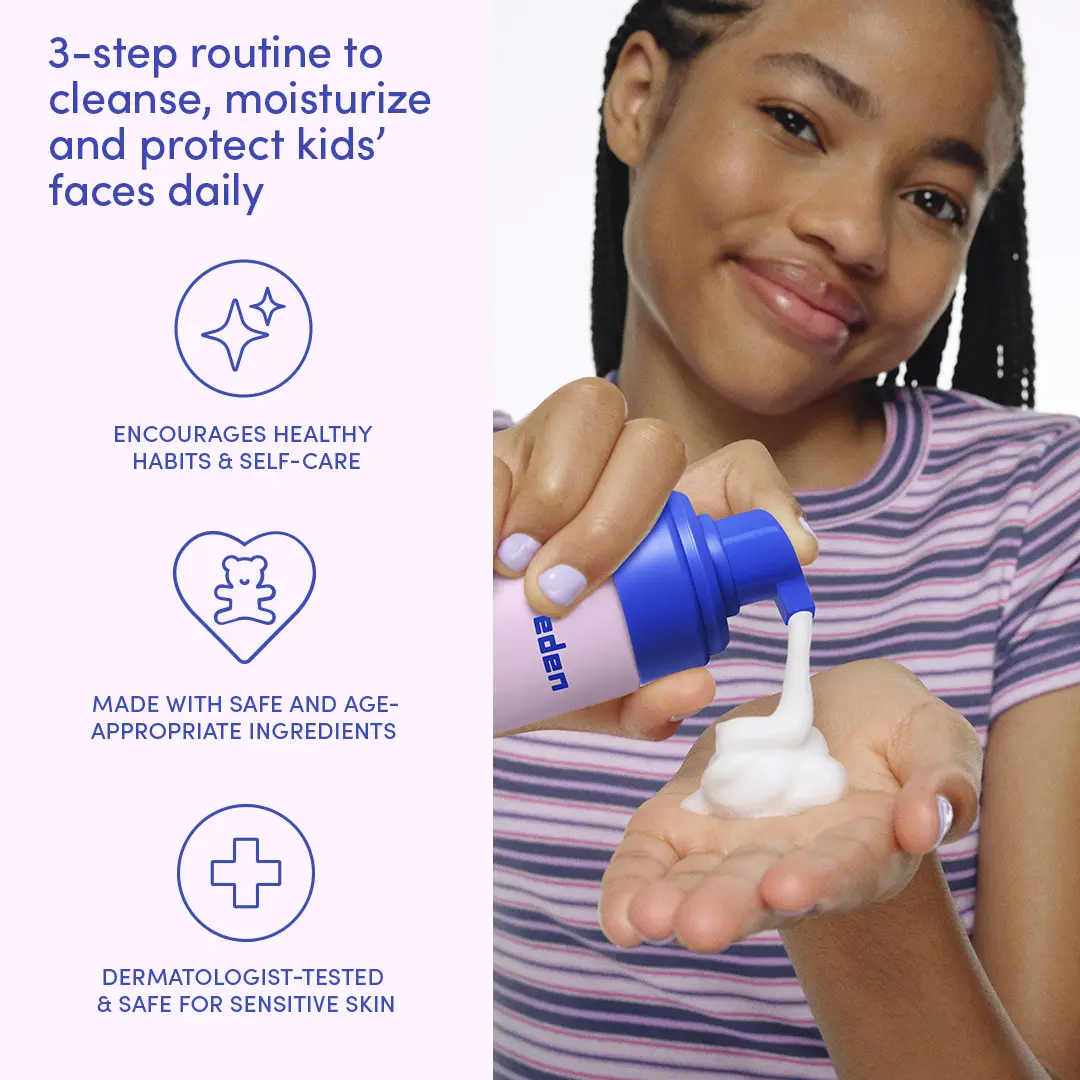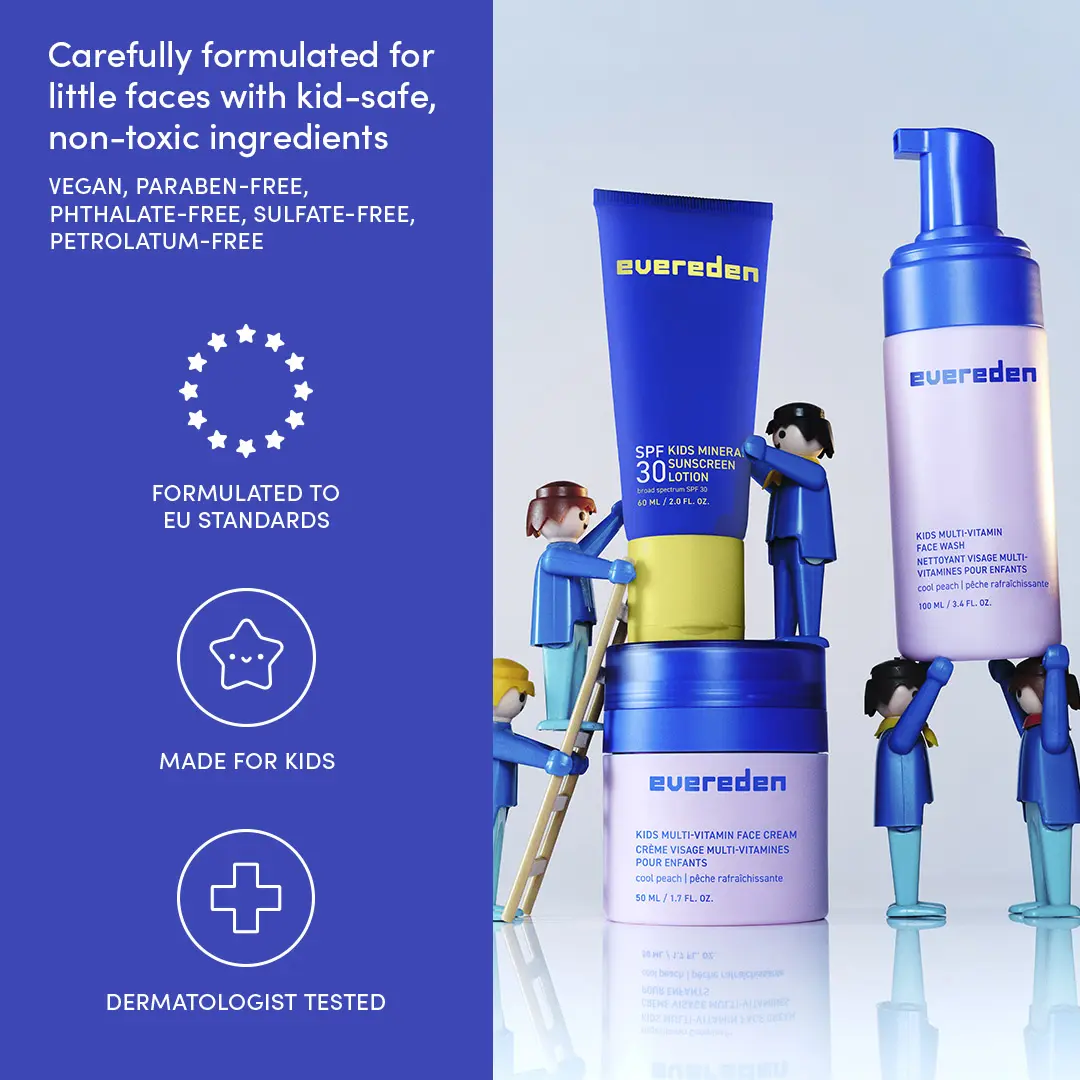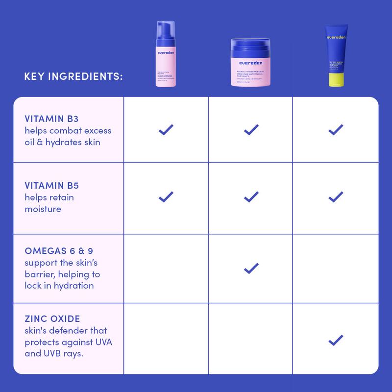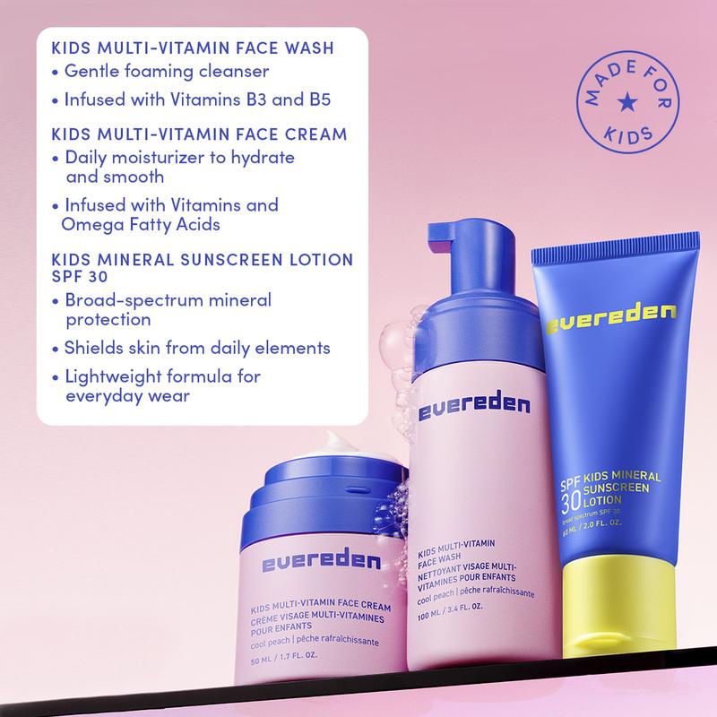 The Evereden Daily 1-2-3 Routine is a simple, kid-friendly skincare system designed to help children build healthy daily habits. This three-step set includes a gentle Multi-Vitamin Face Wash, a lightweight Multi-Vitamin Face Cream, and a mineral-based SPF 30 sunscreen made for young, sensitive skin. Clean, kid-friendly ingredients and easy textures help support comfortable, everyday care. Each set also includes a free Kids Body Lotion for added moisture.
