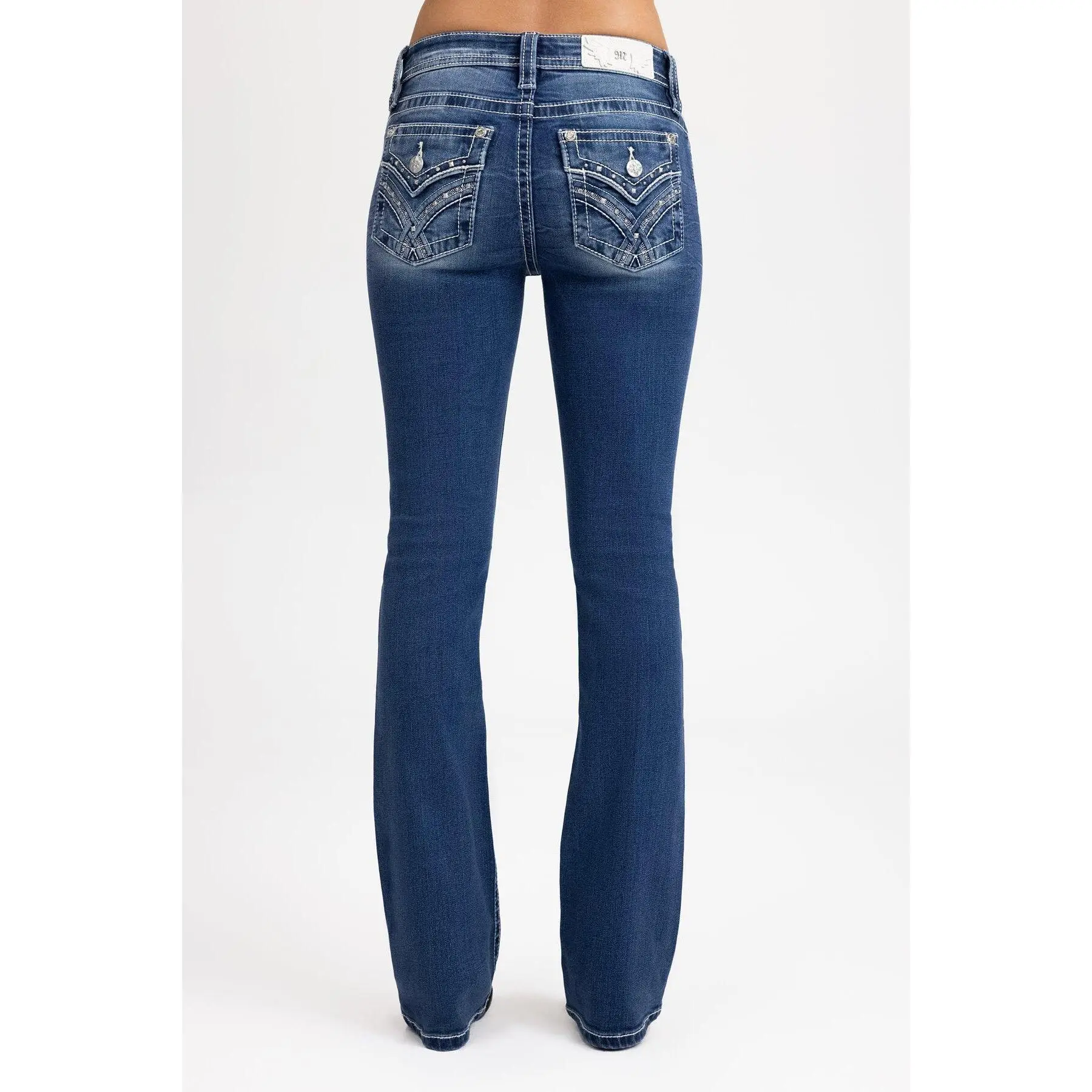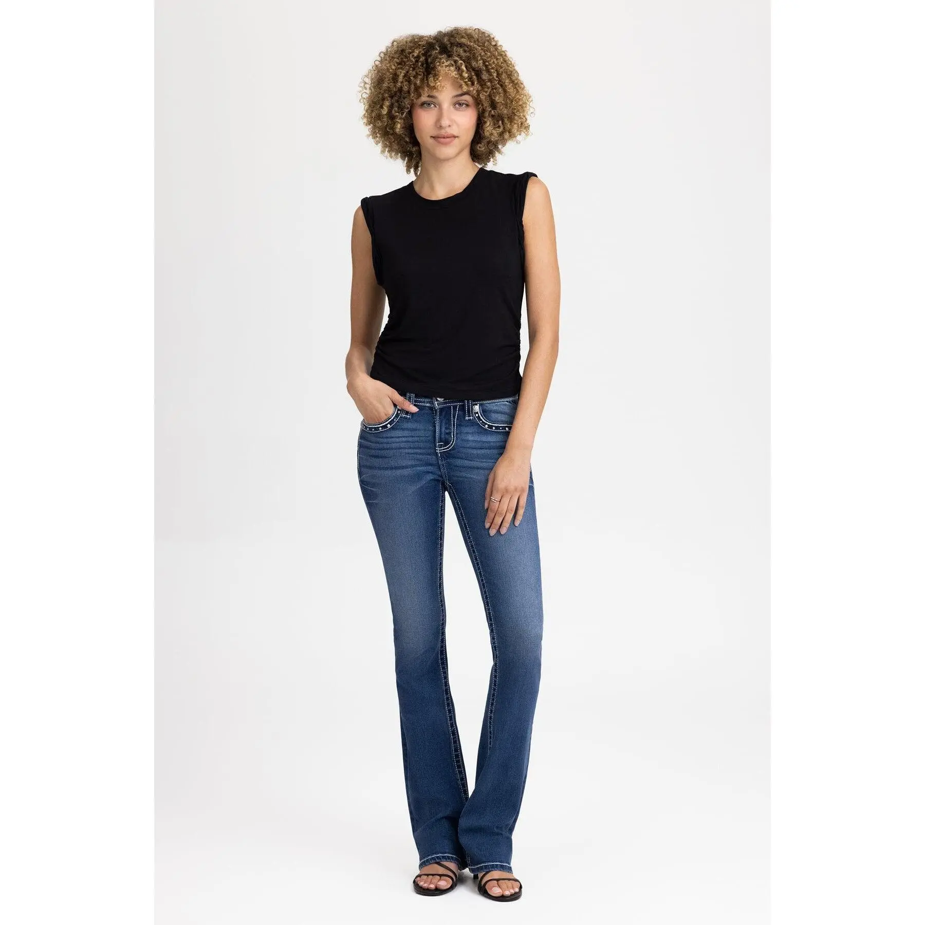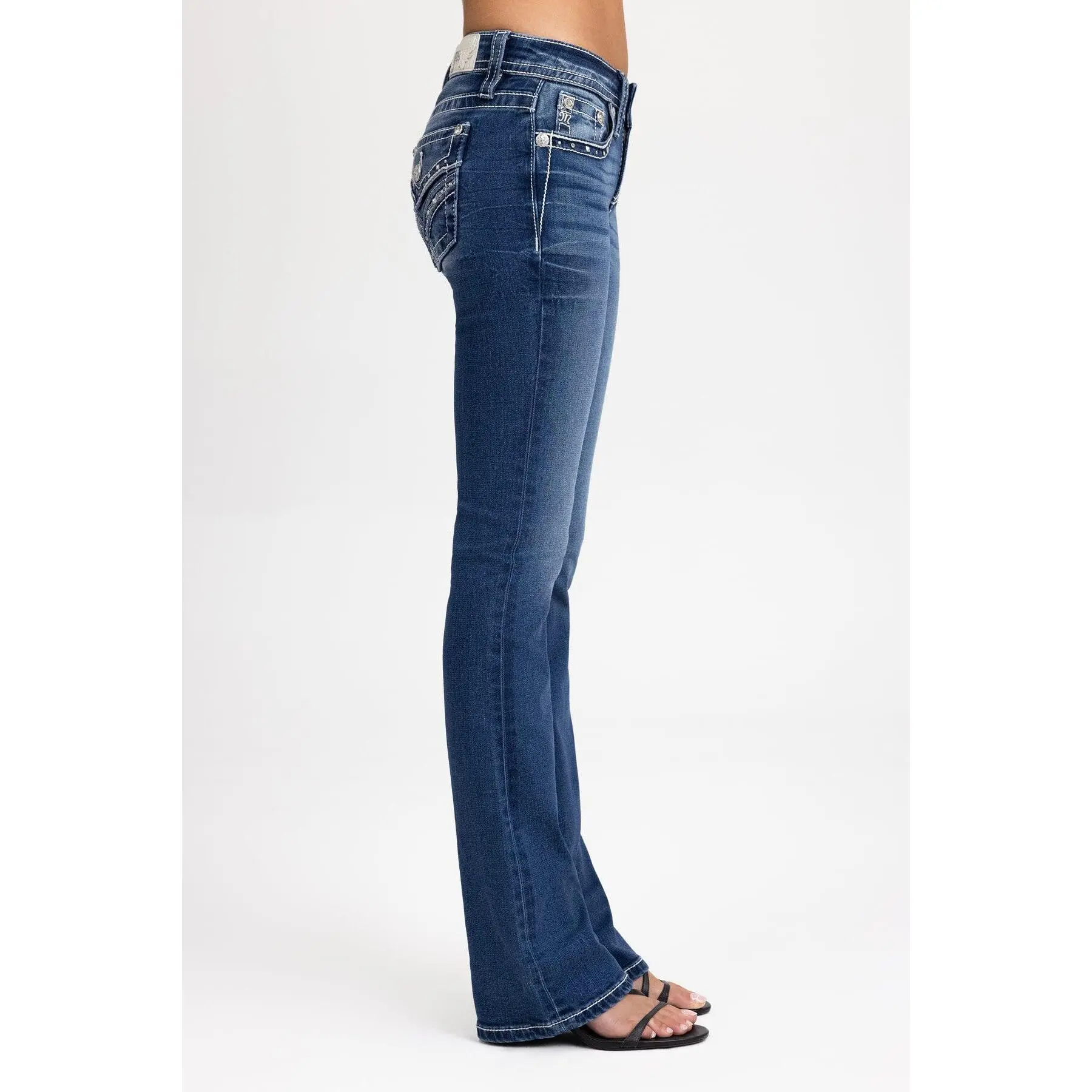 Washed, mid-rise bootcut jeans finished with refined metal and stitch detailing. The slim bootcut cut elongates the legs and enhances natural shape with a clean, structured feel made for everyday wear.