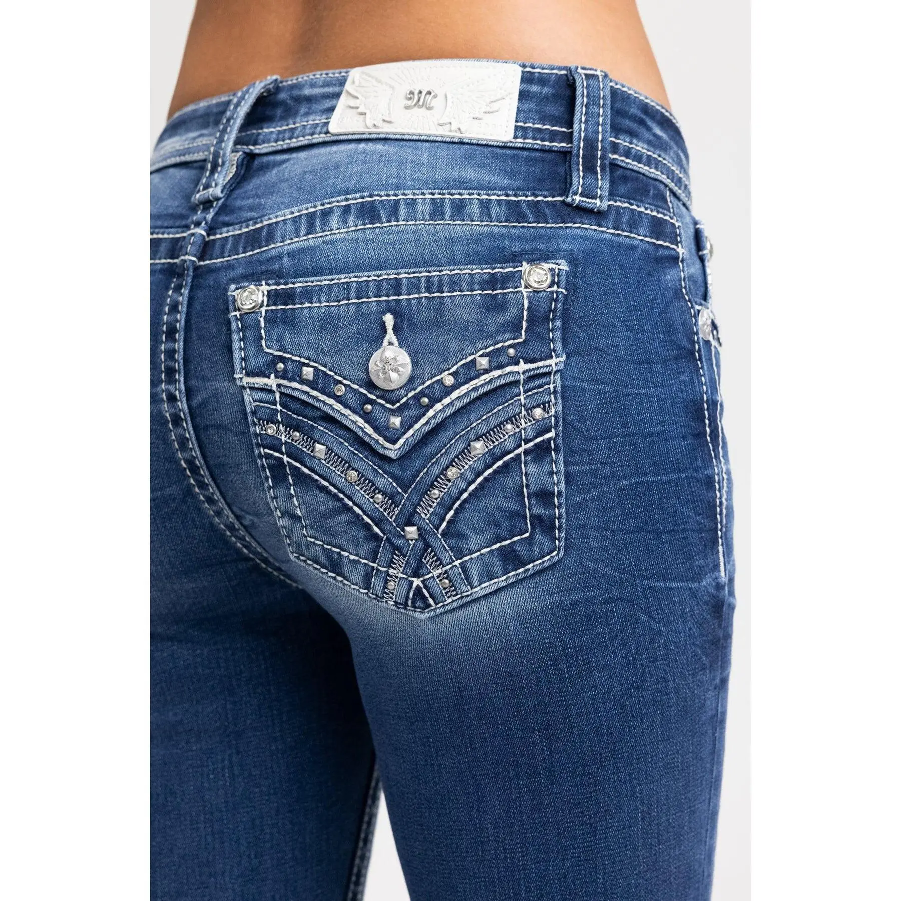 ·Embossed white leather wing Miss Me brand patch