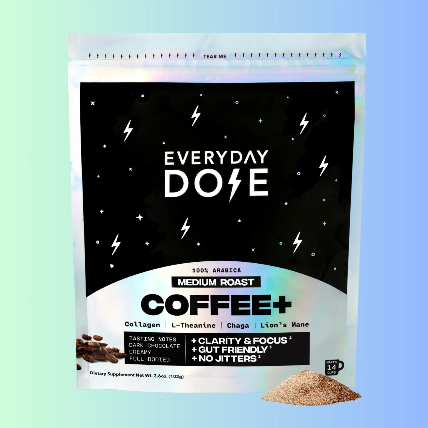 The zipper is doesn't close right after opening and there is no scoop BUT if you need to 💩 this definitely will help! Great benefits and I love that the caffeine is low.