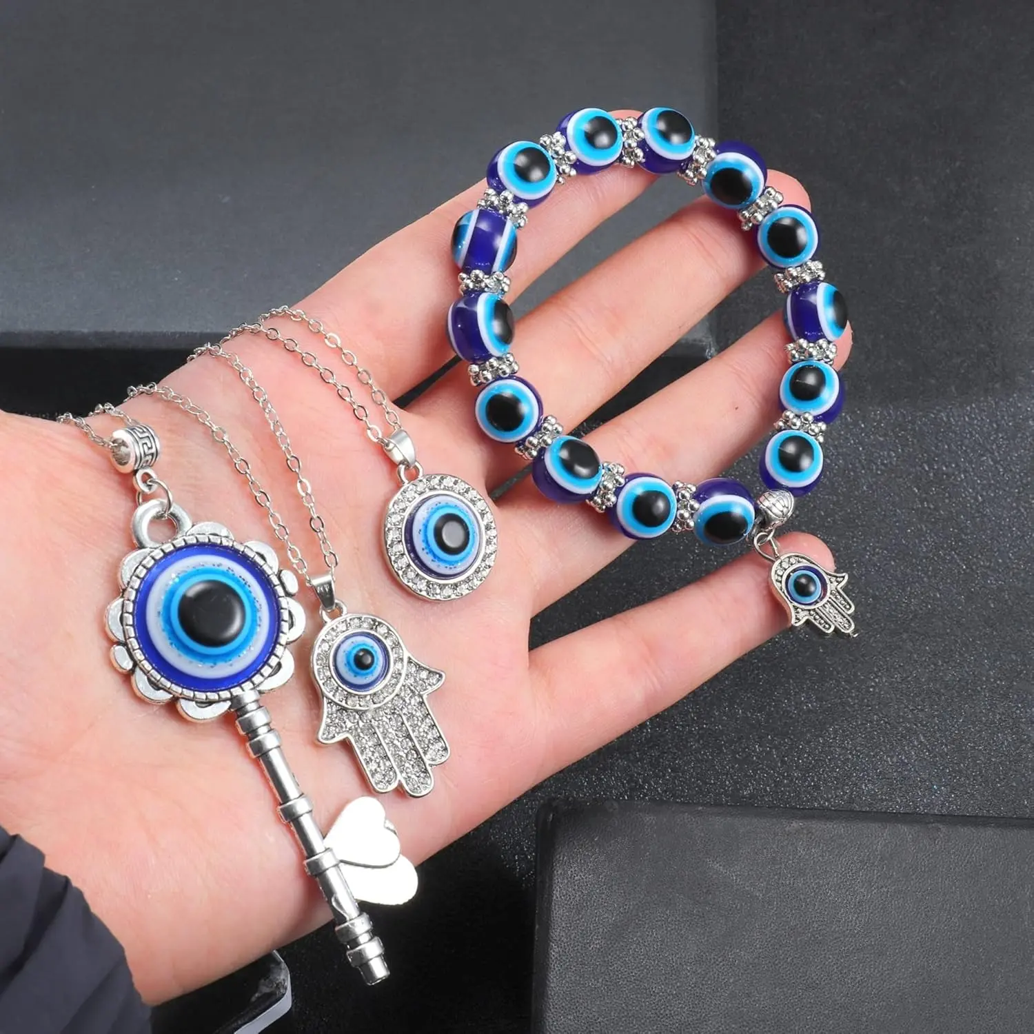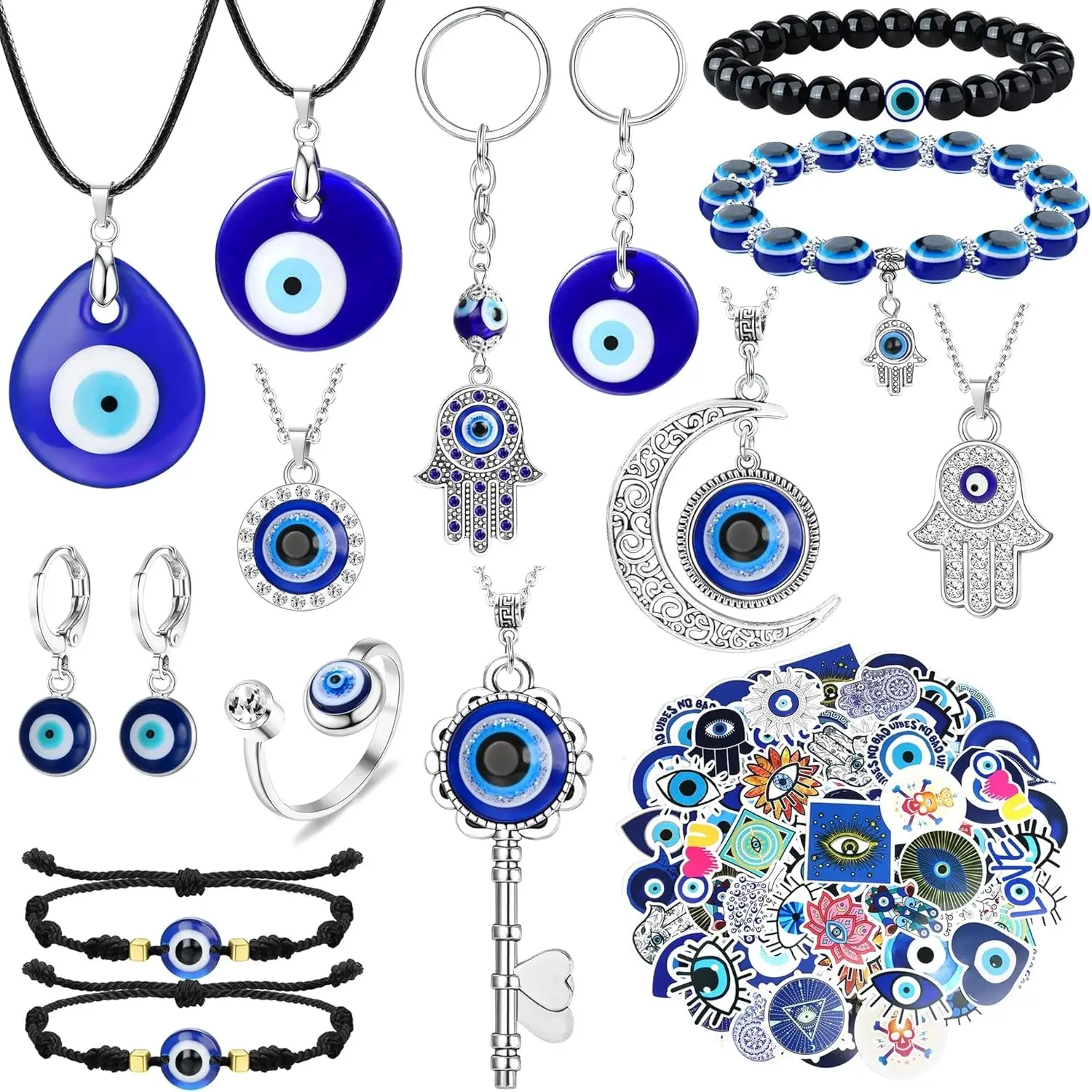 ·EVIL EYE JEWELRY SET One order contains 15pcs different styles of evil eye jewelry,including 6pcs evil eye necklace, 4pcs evil eye bracelets, 2pcs evil eye keychain, 1pair of evil eye hoop earring, 1pcs adjustable evil eye ring and 50pcs evil eye stickers, various styles and abundant quantities, can meet your different needs, hope evil eye jewelry can protect you and bring you good luck.