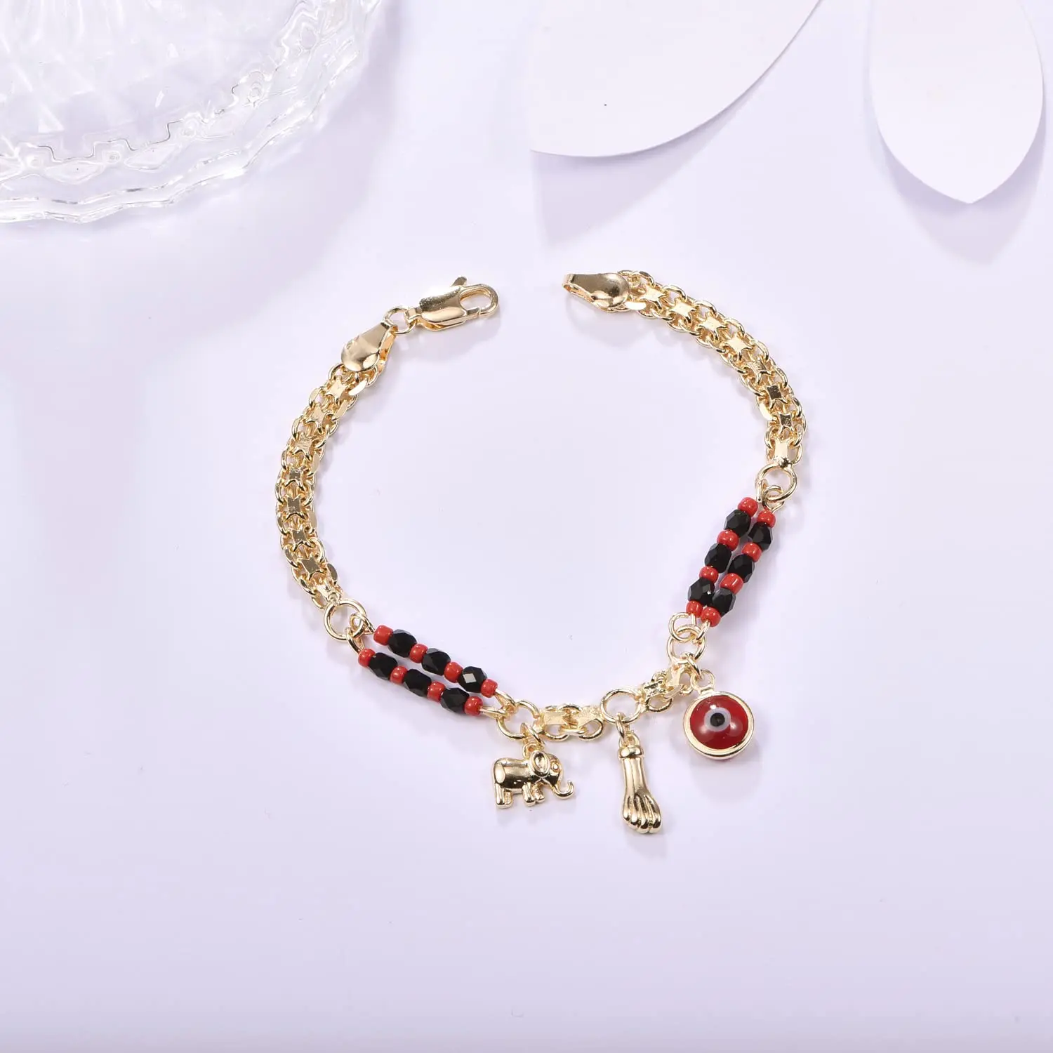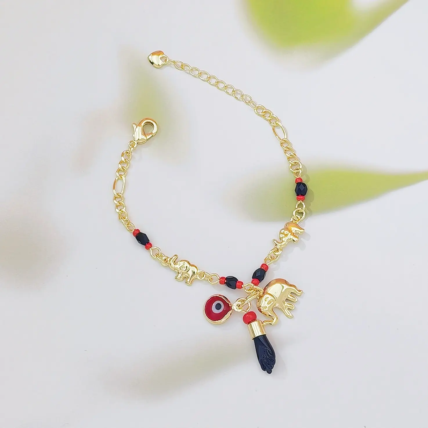 Evil Eye Red Eye Bracelet and Anklet with Cross Pendant and Round Bead Chain, 18K Gold Plated