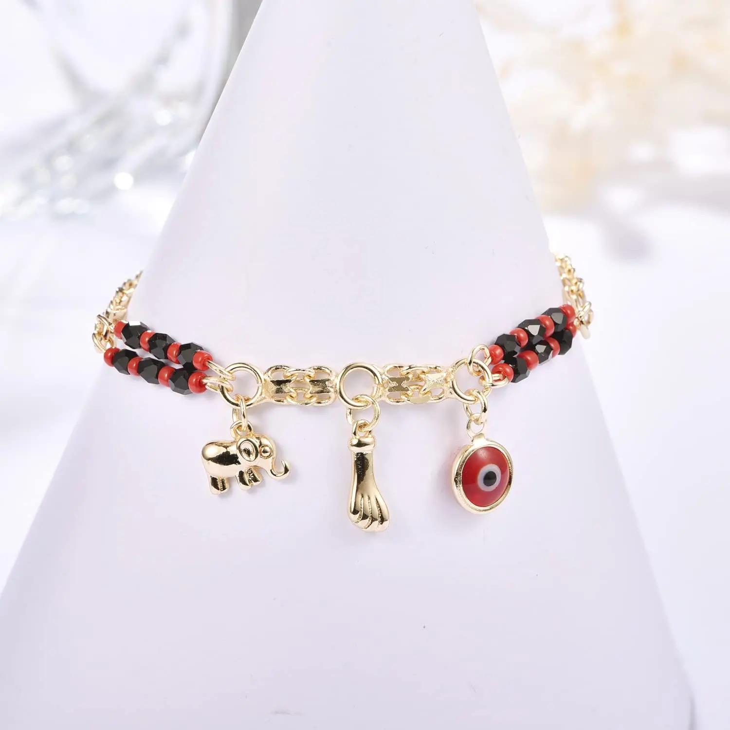 5. Evil Eye Red Eye Bracelet and Anklet with Cross Pendant and Round Bead Chain, 18K Gold Plated