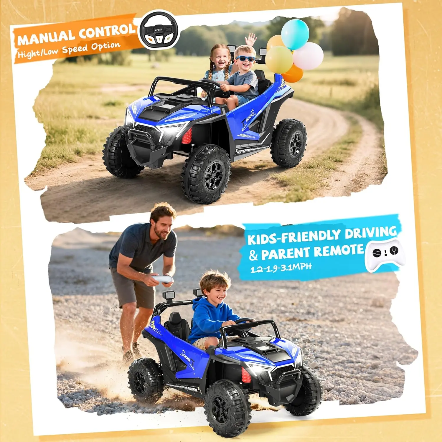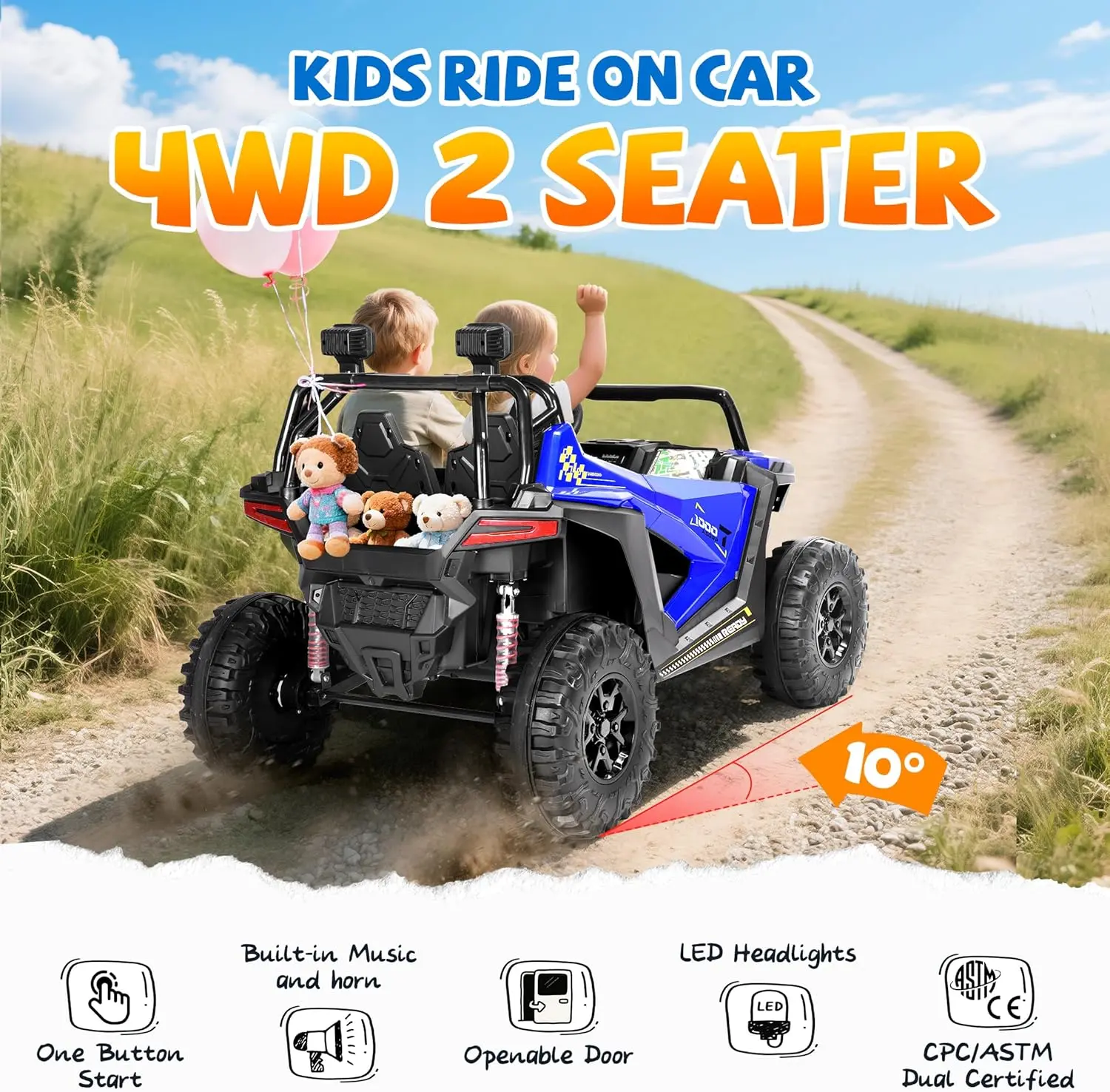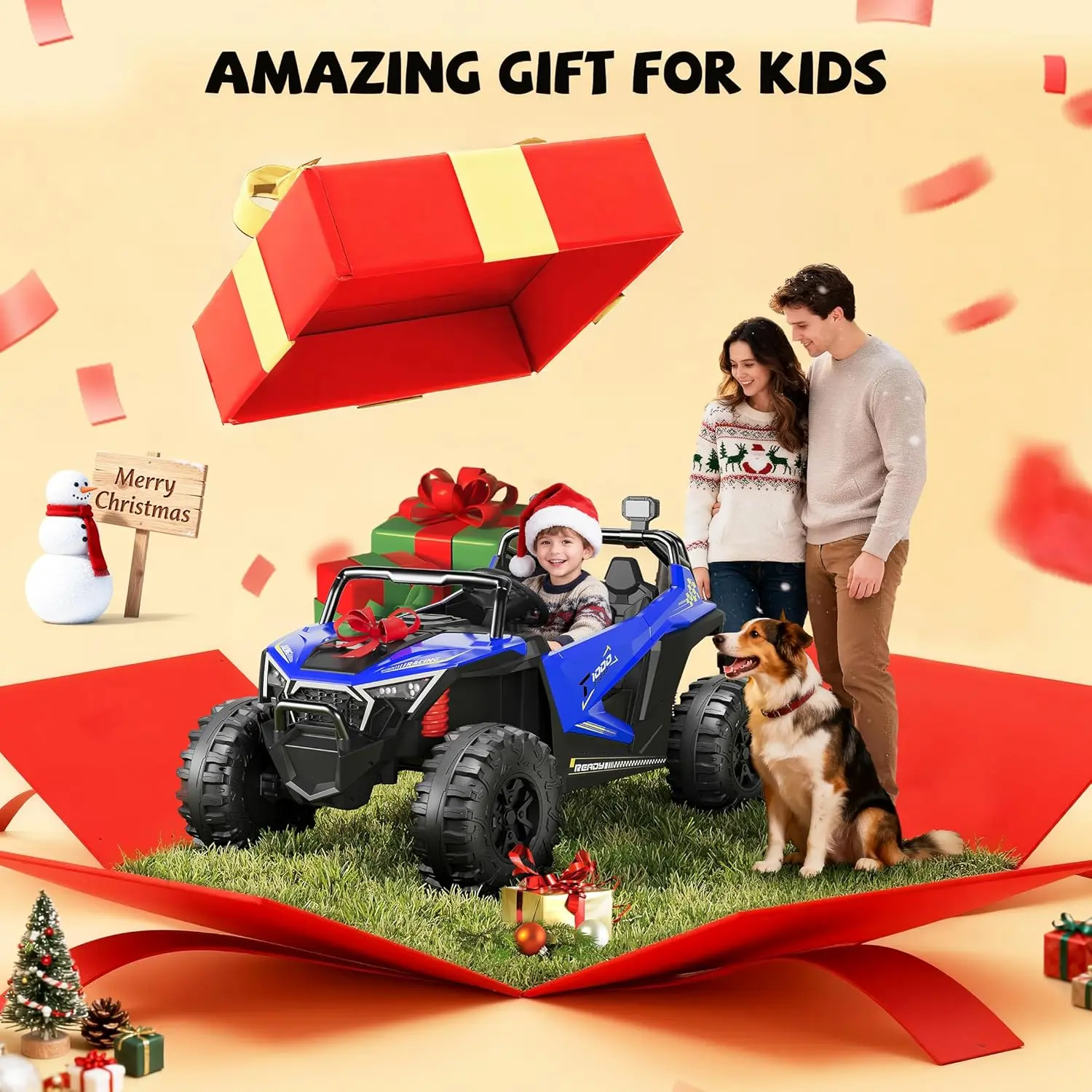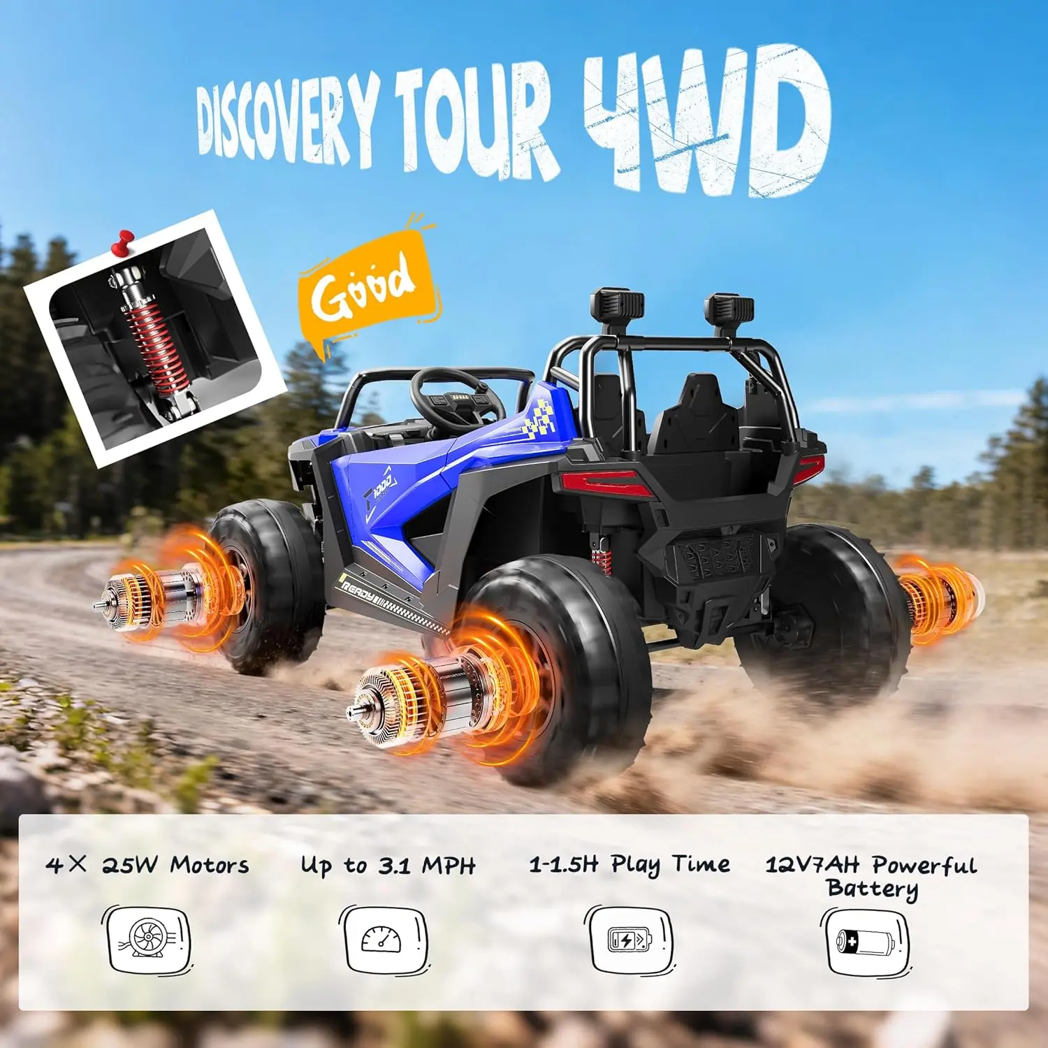 ·【Powerful Performance】- The 12V 2 seater ride on car for kid boasts a robust 4WD motor paired with a 12V 7Ah rechargeable battery. This combination delivers stable voltage and impressive 10° hill-climbing capability, enabling the ride on toys to effortlessly carry up to 110 pounds. Your child can enjoy 60-90 minutes of uninterrupted playtime, developing driving skills and confidence in a secure environment while experiencing unique driving enjoyment.