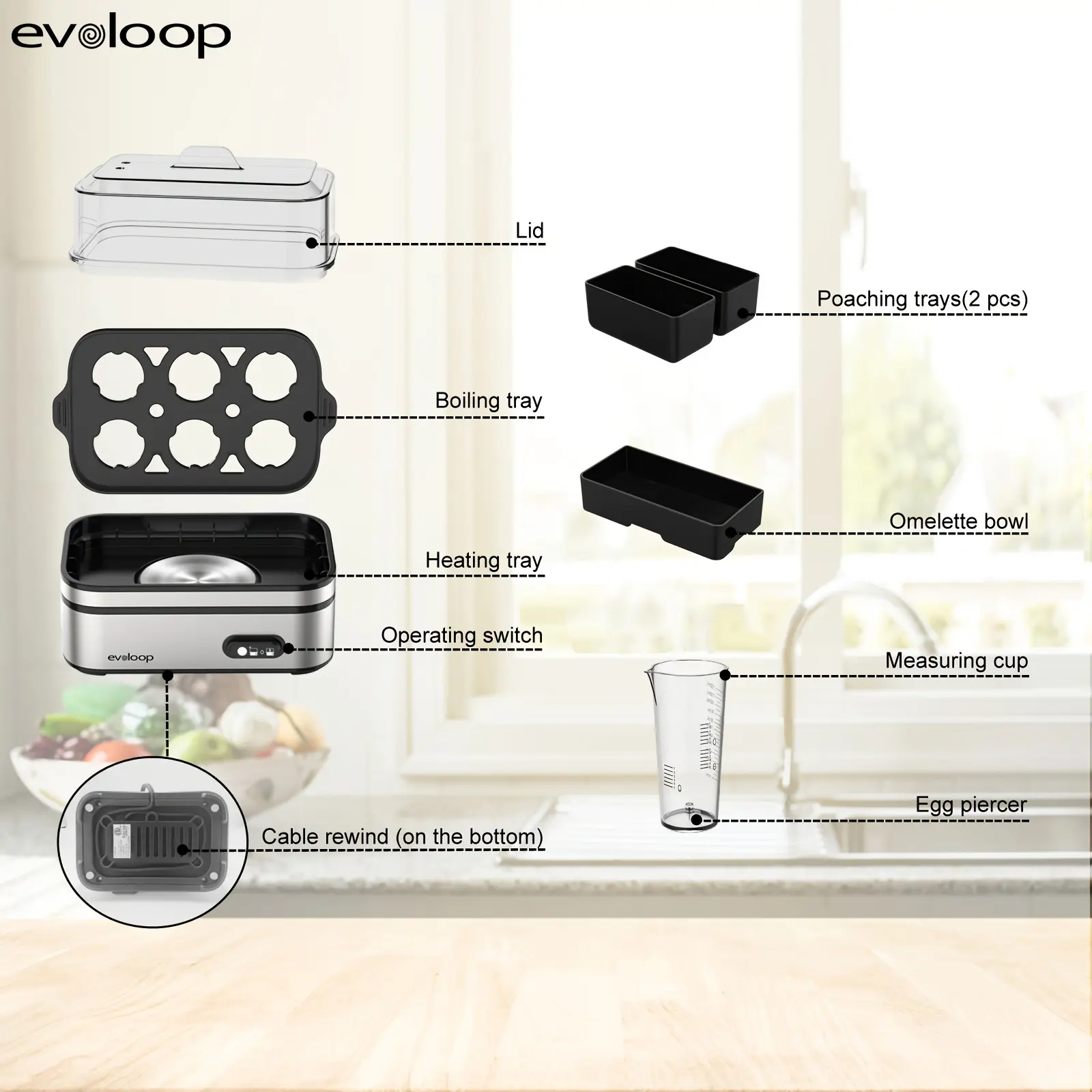 ·PACKAGE INCLUDE: The Evoloop rapid egg cooker includes two poaching trays, one omelet tray, one egg holder trays, one cup with a hole puncher, and a colorful instruction manual featuring eighteen delicious recipes