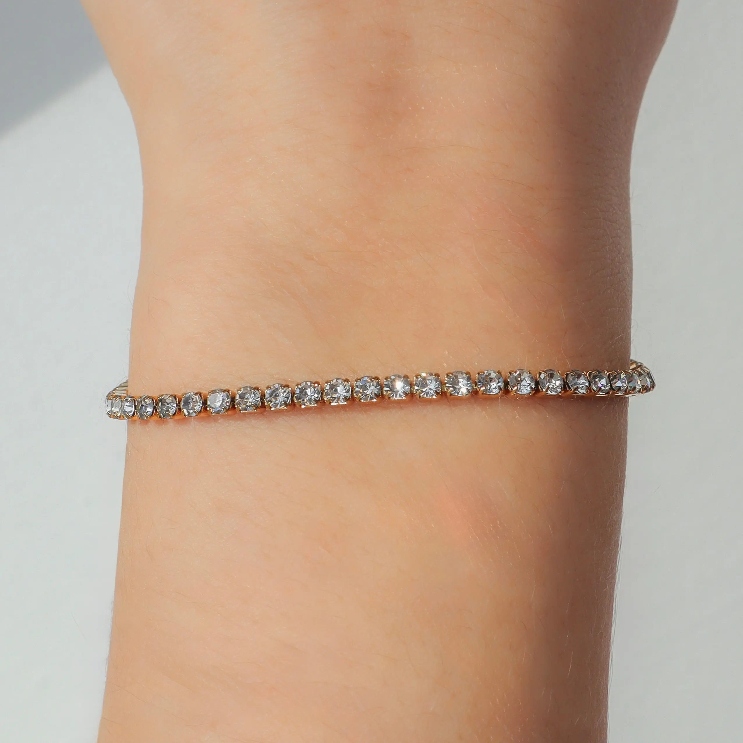 A slim gold tennis bracelet featuring sparkling round stones. Dainty and elegant, this timeless bracelet is perfect for stacking or wearing solo for subtle everyday shine.