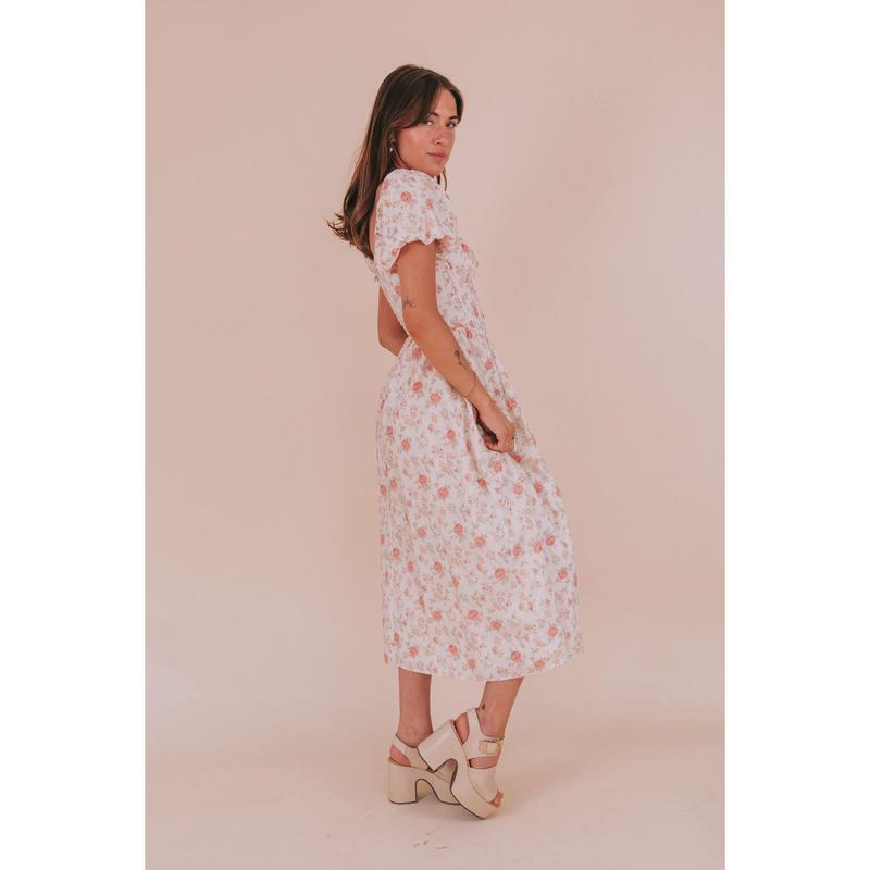 Get ready to stun in our EXCLUSIVE - Cottage Garden Dress. The delicate floral print and ruched bust are perfect for a garden party look. With a front keyhole and drawstring neckline featuring a tied bow, the dress offers a unique twist. Boning in the bodice provides structure while short puff sleeves and a side slit add a touch of charm.