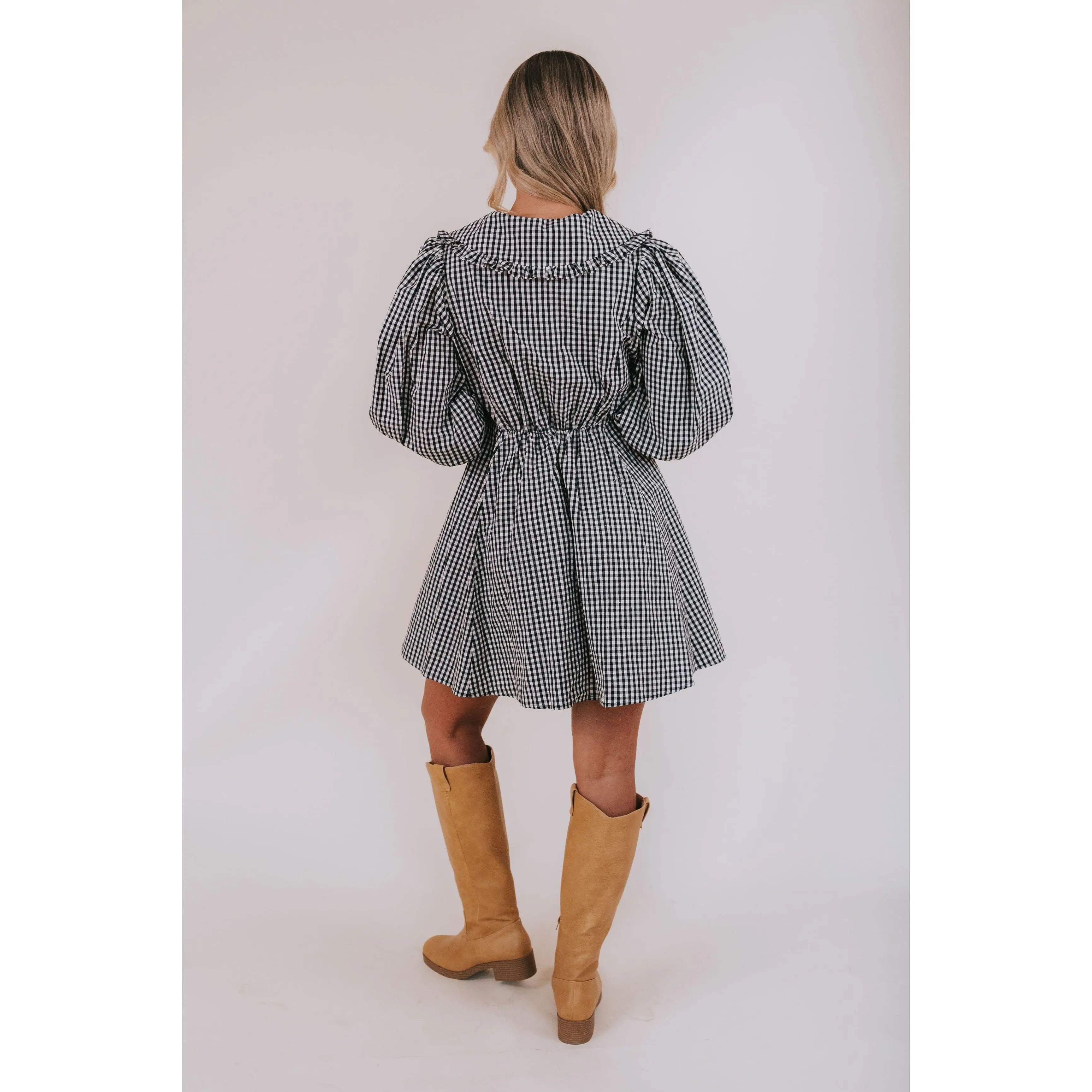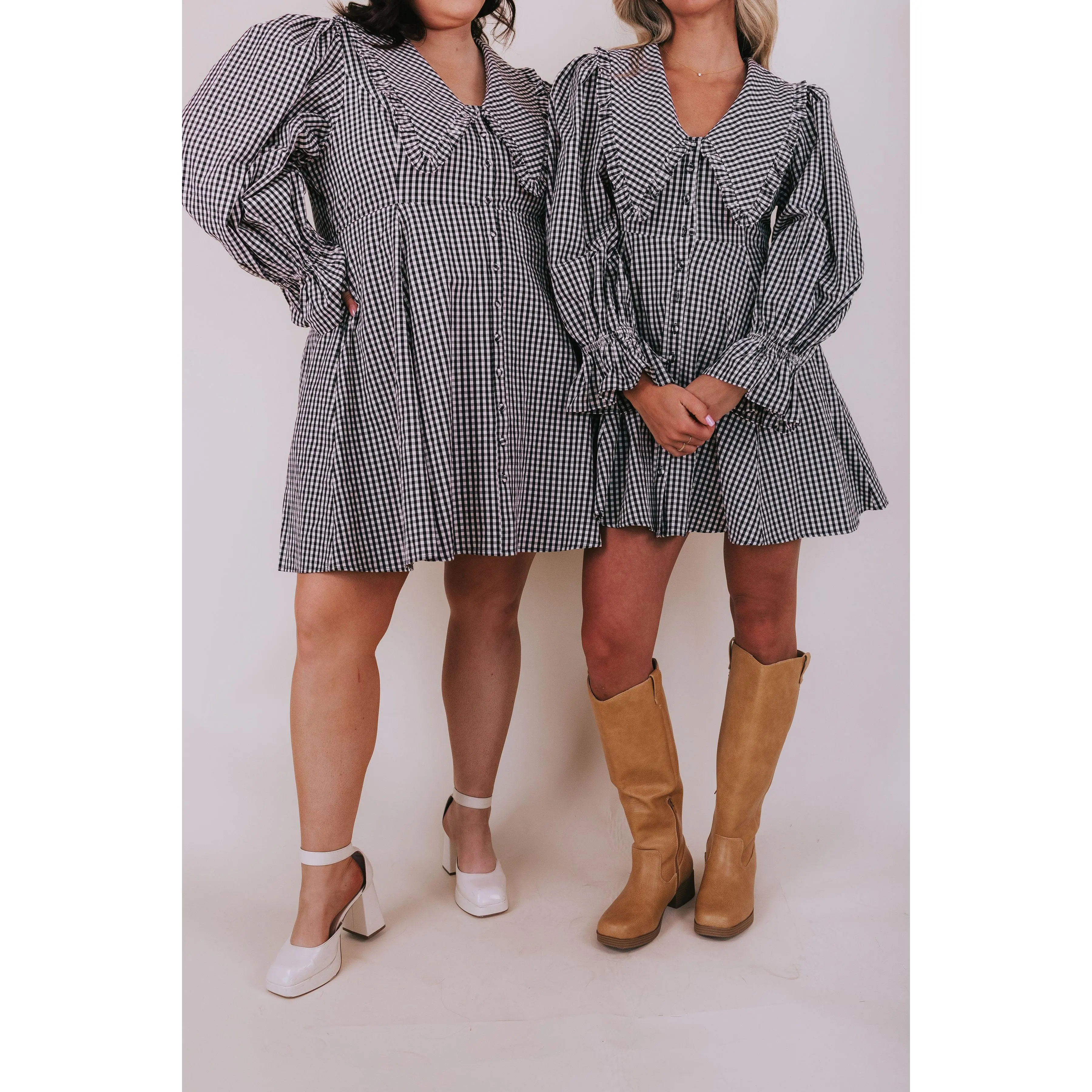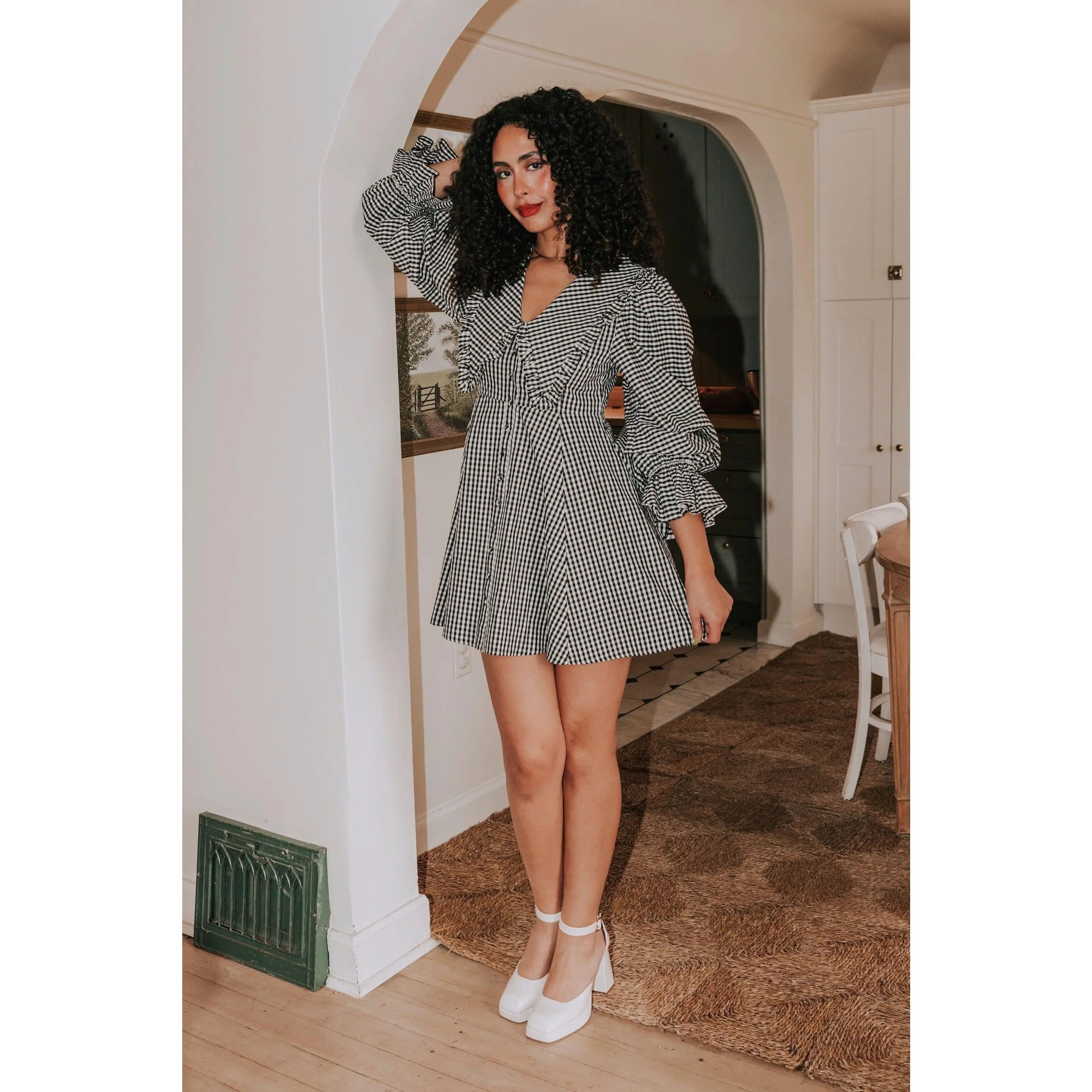 Embrace effortless charm with the Everyday Romance Dress. Its gingham print and ruffle-trimmed pan collar set a sweet tone, while the button-down front and long poet sleeves add a touch of vintage romance. A flirty V-neckline and elastic back waistband ensure a flattering fit, and the mini length with pockets makes this dress as practical as it is pretty.