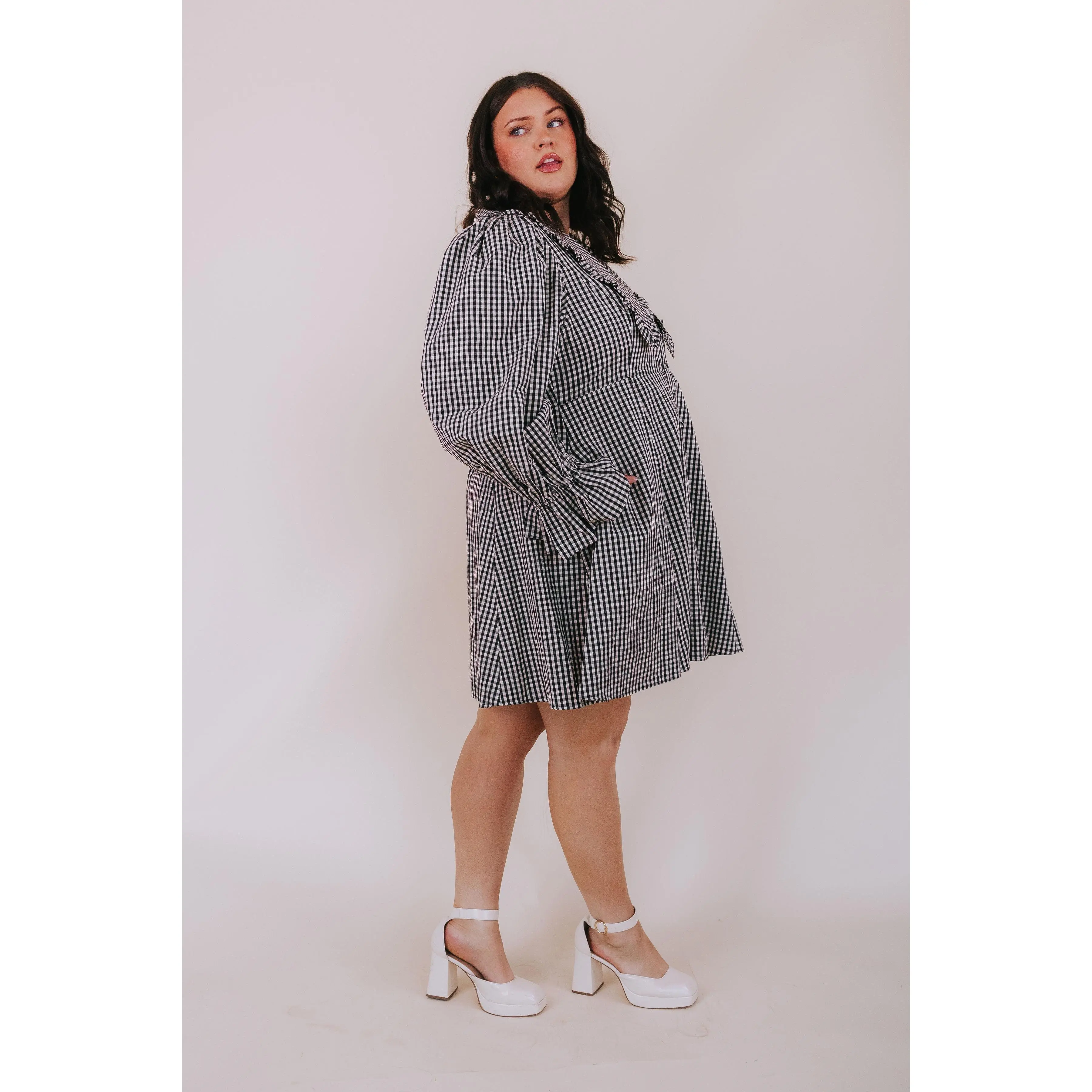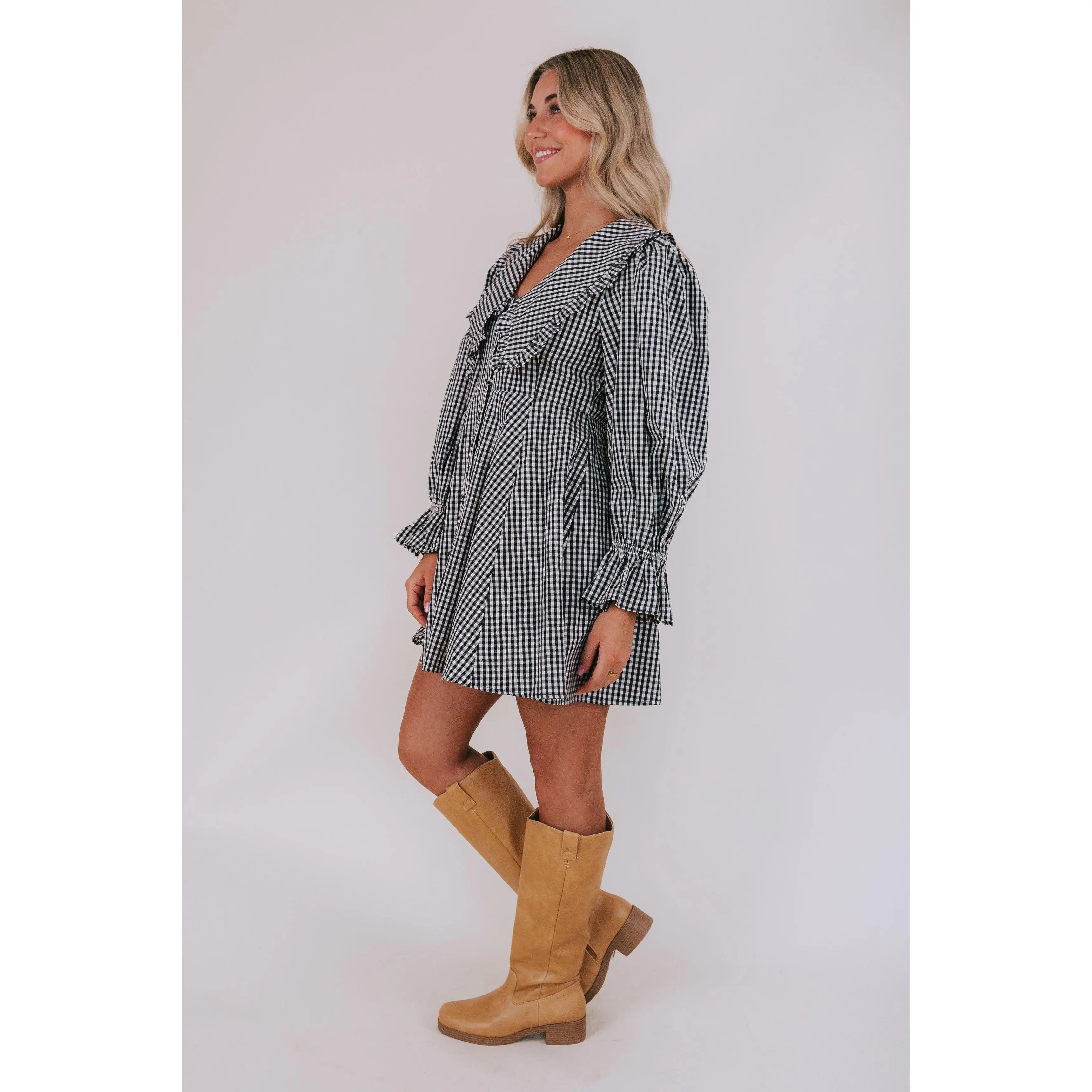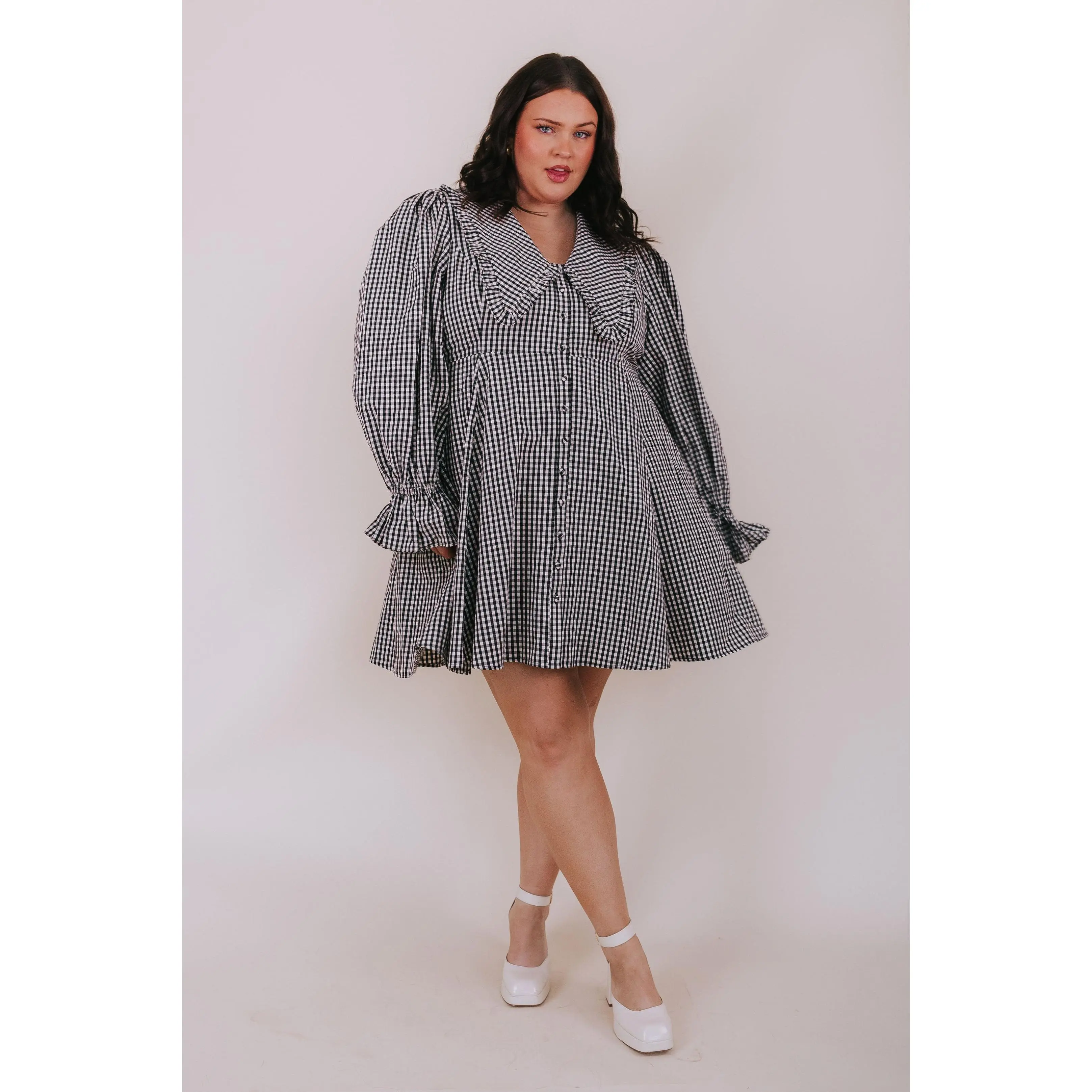 Embrace effortless charm with the Everyday Romance Dress. Its gingham print and ruffle-trimmed pan collar set a sweet tone, while the button-down front and long poet sleeves add a touch of vintage romance. A flirty V-neckline and elastic back waistband ensure a flattering fit, and the mini length with pockets makes this dress as practical as it is pretty.