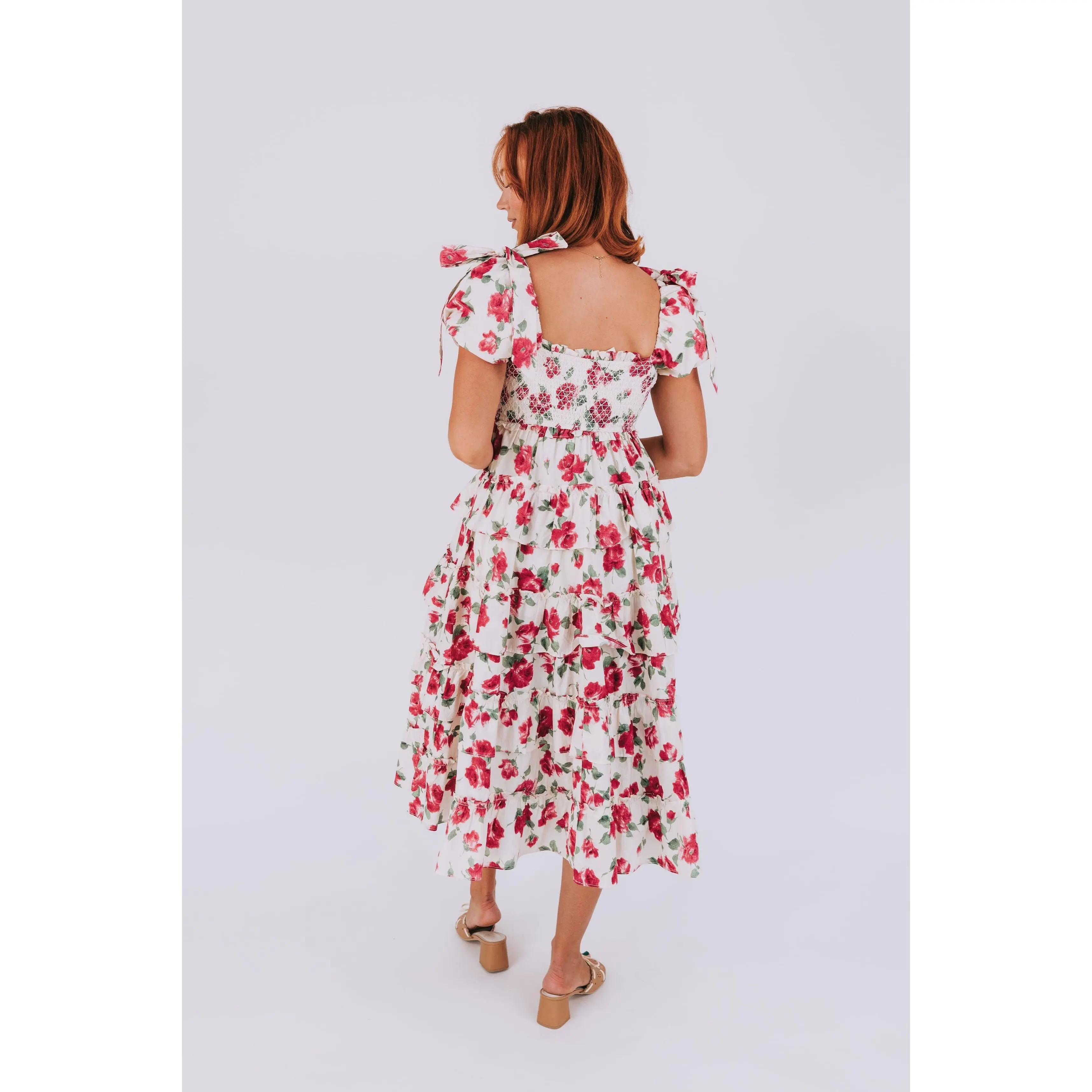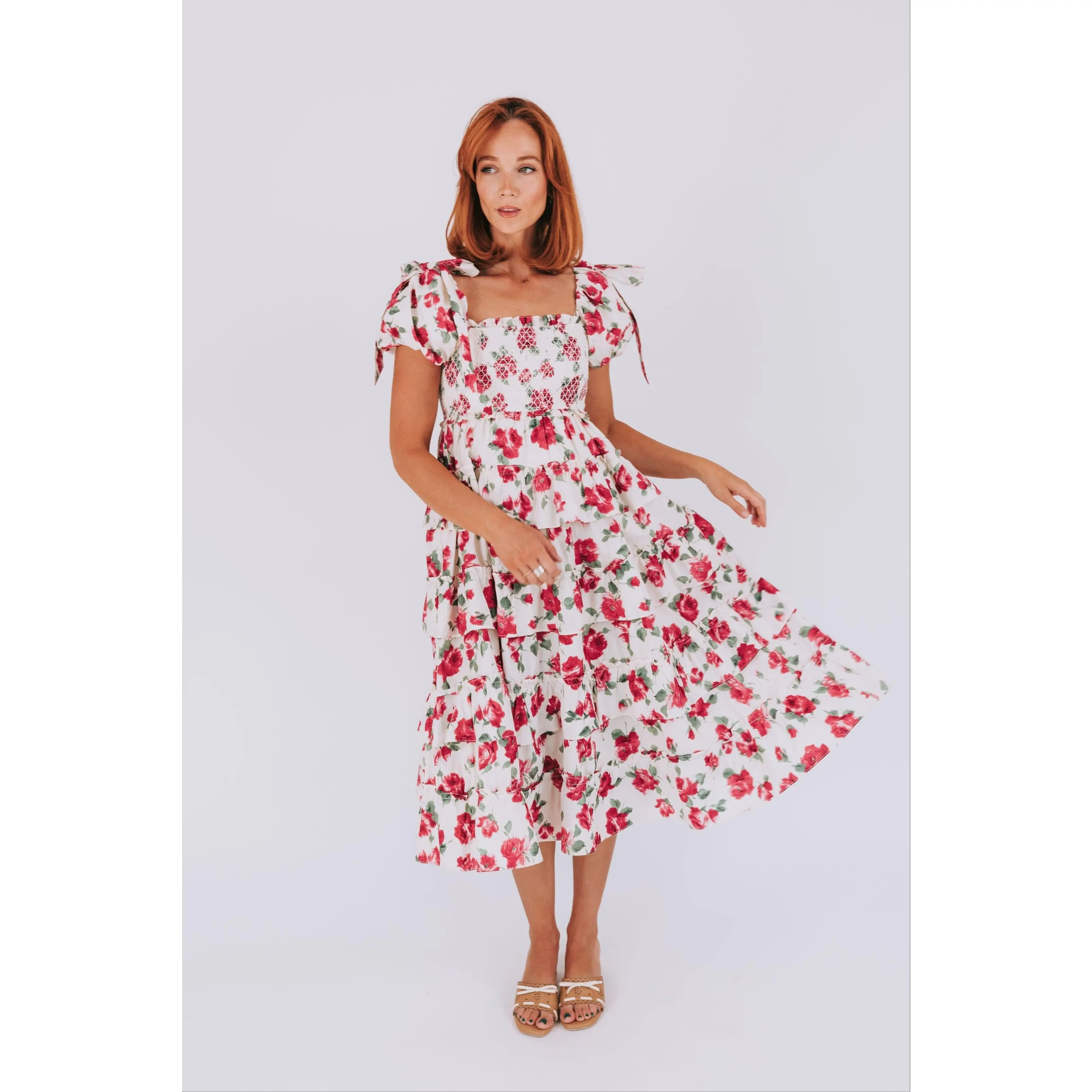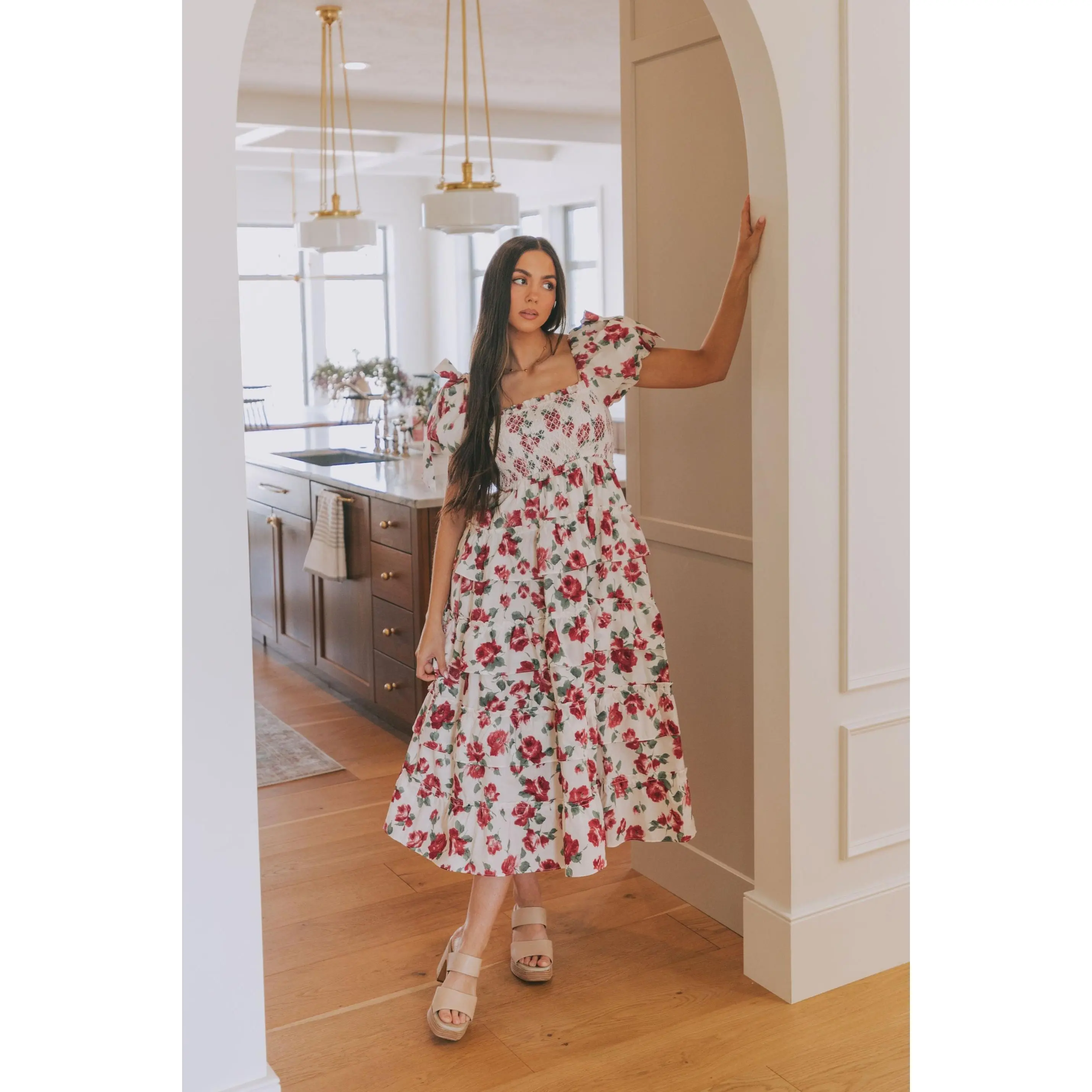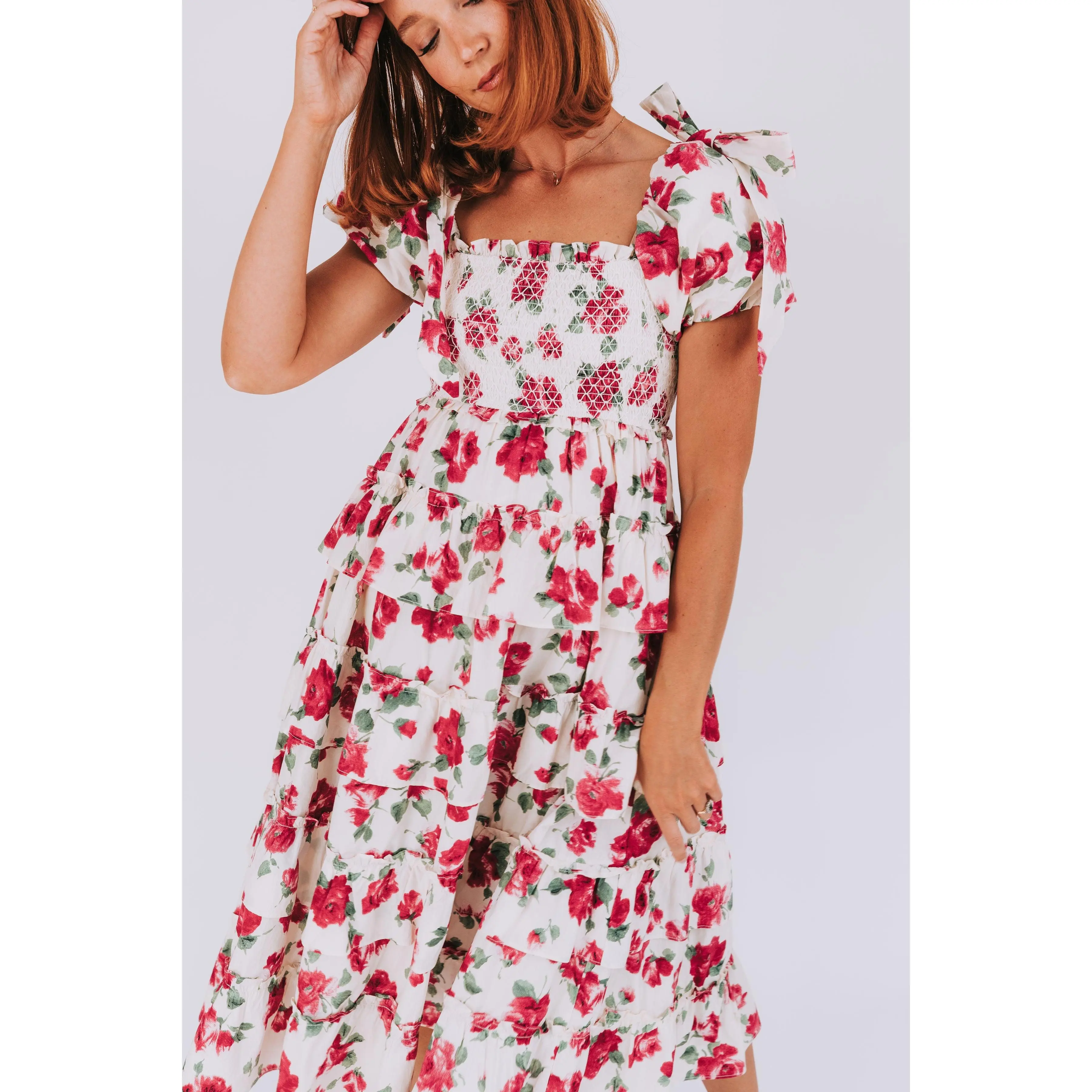 Get ready to turn heads in our EXCLUSIVE Wish I Knew Dress! This playful midi dress features a tiered skirt and a beautiful floral pattern in berry and green on an ivory base. The square neck with elastic in the shoulders adds a unique touch, while the bows on the shoulders add a touch of whimsy. The smocked bodice (with stretch!) and white stitching detail make this dress both comfortable and stylish. Don't miss out on this must-have dress!